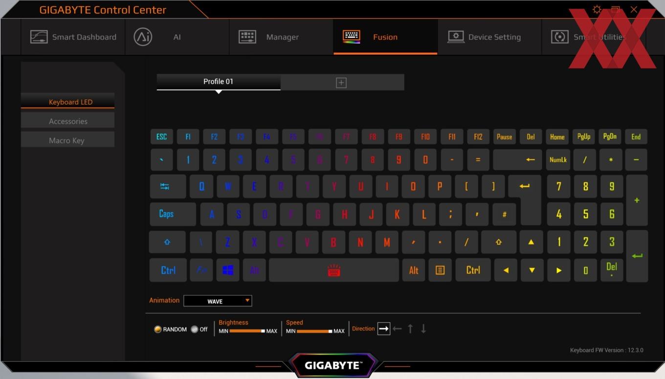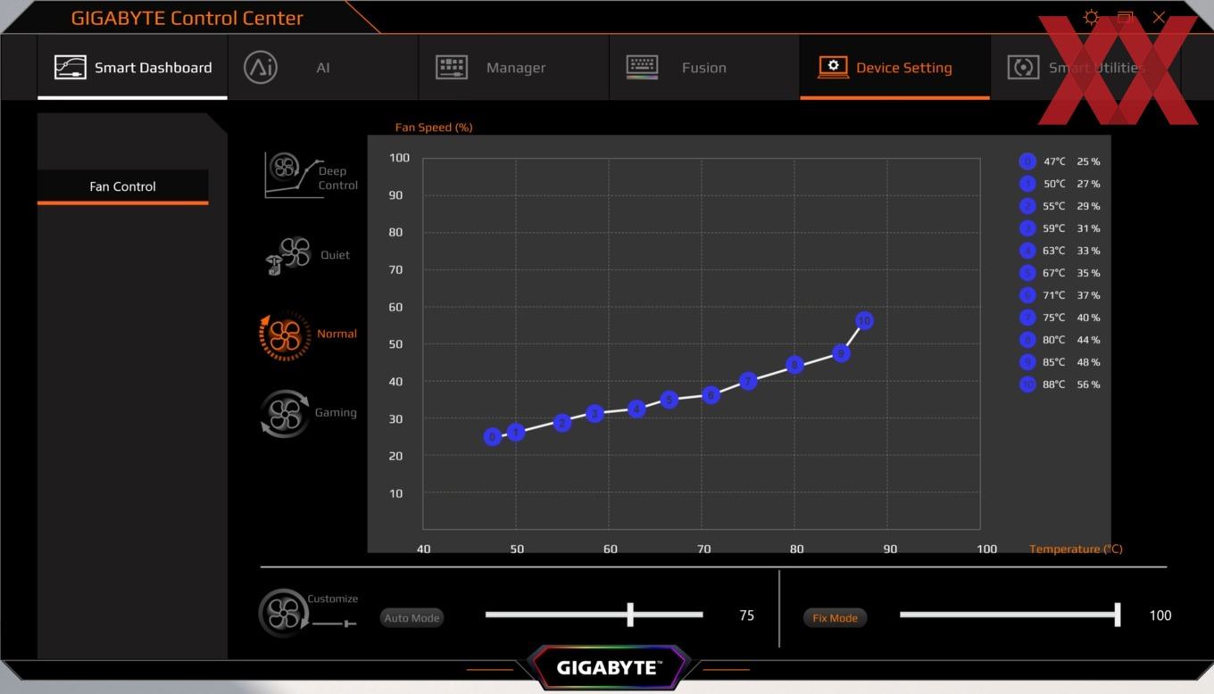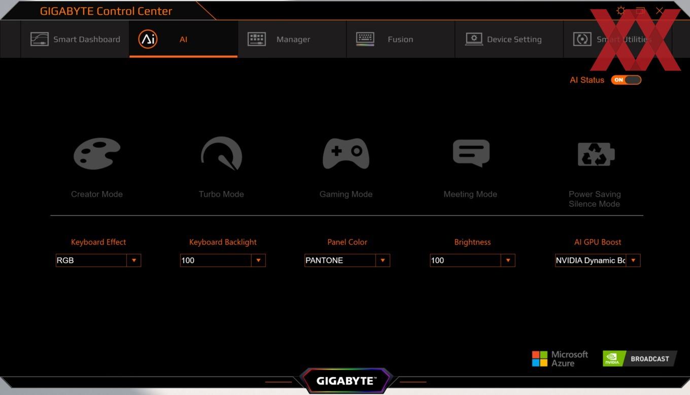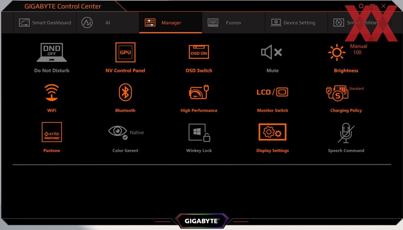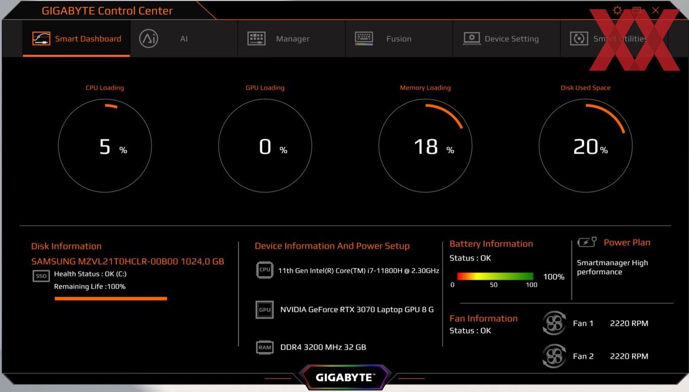 Keine Neuerungen gibt es bei der Software. Auch beim Gigabyte AERO 15 OLED XD dient das Control Center als zentrale Anlaufstelle für alle wichtigen Einstellmöglichkeiten des Notebooks. So lassen sich darüber nicht nur die Temperatur-Werte des Intel Core i7-11800H und der NVIDIA GeForce RTX 3070 Laptop auslesen, sondern auch die Speichernutzung des Arbeitsspeichers und der M.2-SSD. Die Batterieleistung lässt sich ebenso einsehen, wie die Lüftergeschwindigkeiten auslesen oder der Power-Plan anpassen. Über den Fusion-Reiter kann die Hintergrundbeleuchtung der Tastatur geregelt werden.