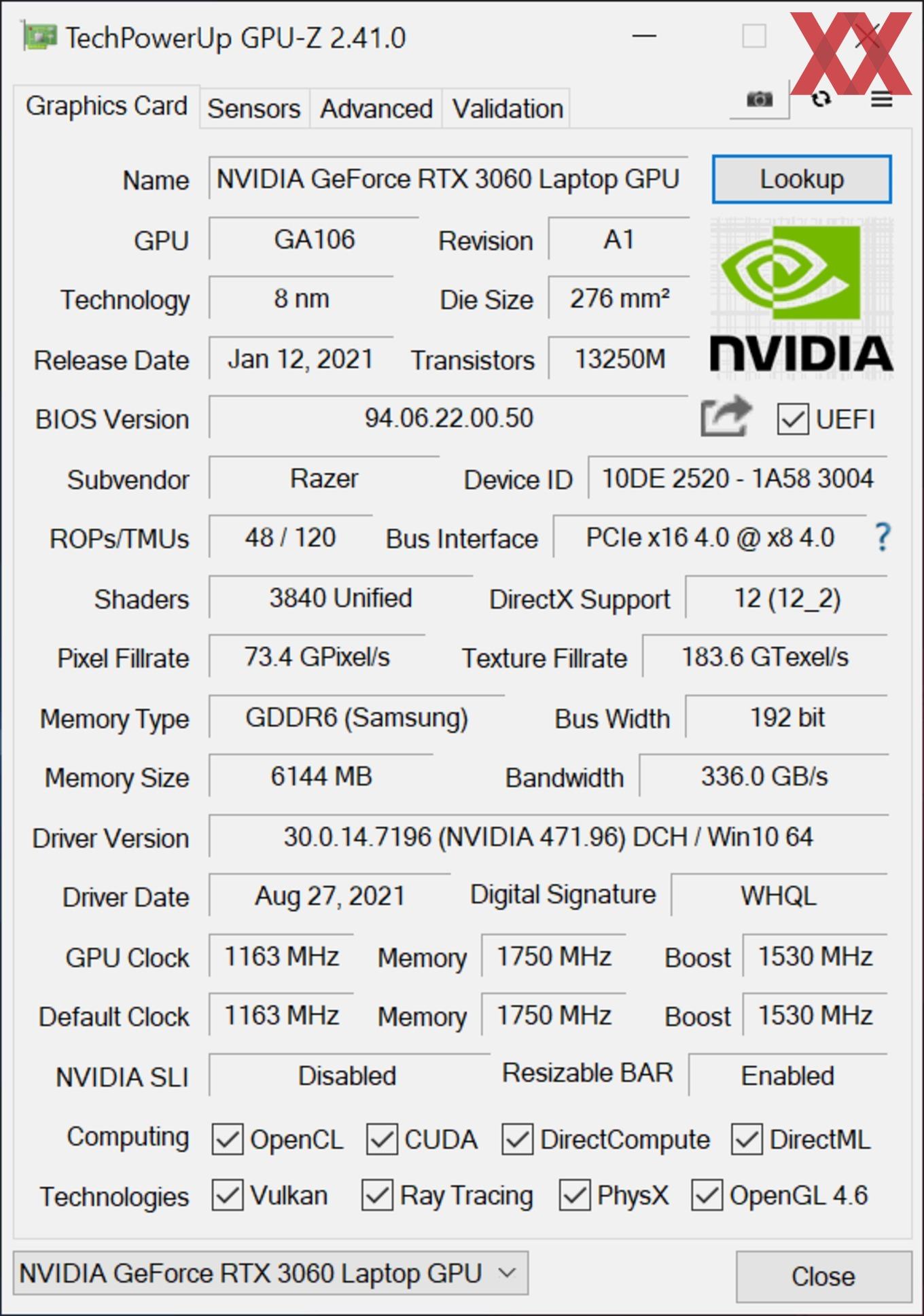 Sie basiert natürlich auf der aktuellen Ampere-Architektur und baut auf der rund 17,4 Milliarden Transistoren starken GA104-GPU auf, die mit 3.840 Shadereinheiten und einem 6 GB großen GDDR6-Videospeicher bestückt ist. Letzterer erreicht einen Takt von 1.500 MHz und wird über einen 192 Bit breiten Speicherkanal angebunden, womit eine maximale Bandbreite von theoretisch 288 GB/s erreicht werden kann. Dank der hohen TGP soll die GPU im Boost mindestens 1.530 MHz erreichen, wohingegen der Basistakt mit 1.163 MHz angegeben wird. Dieser Takt wird von unserem Testgerät mühelos erreicht und teilweise sogar übertroffen.