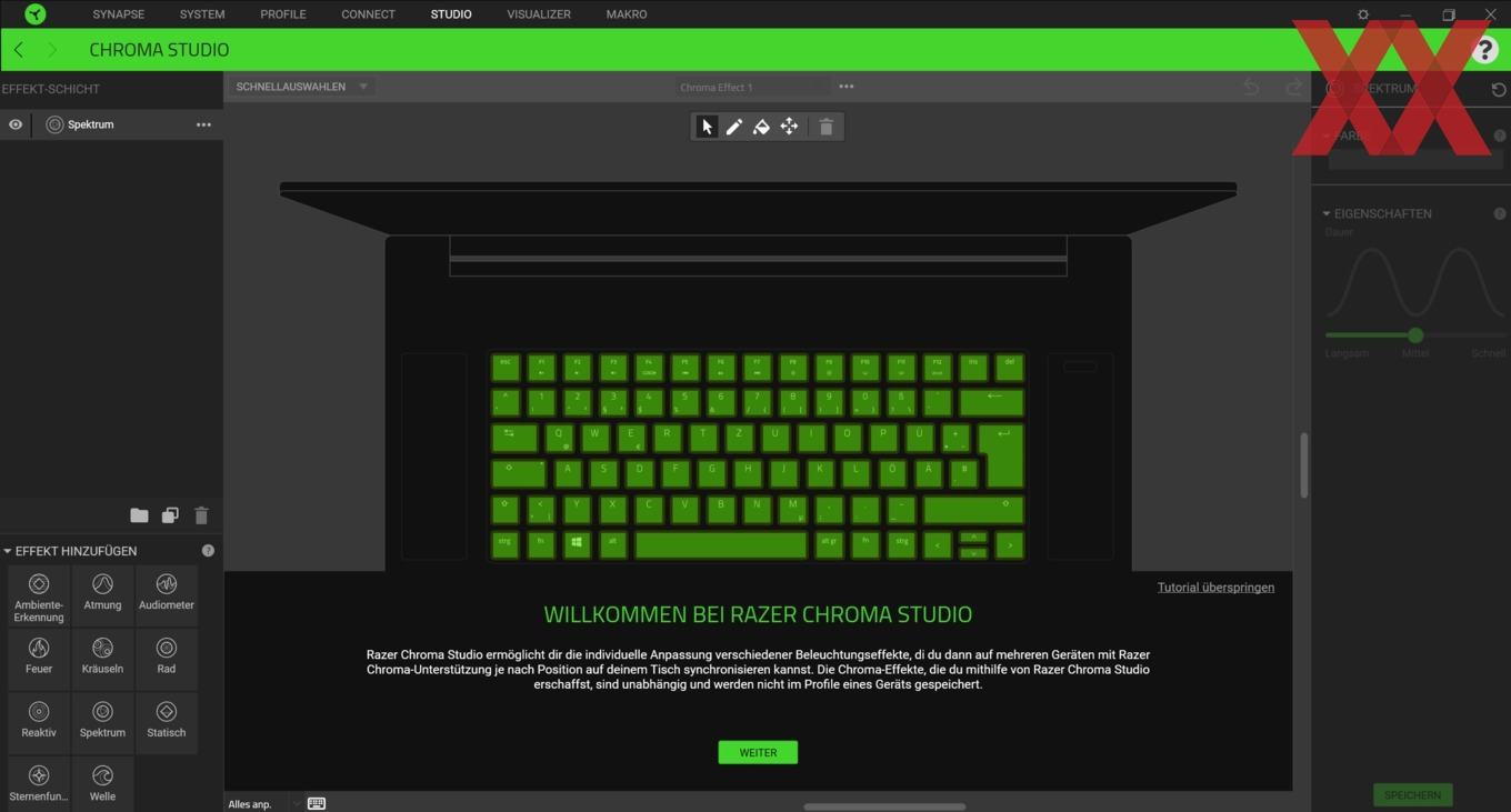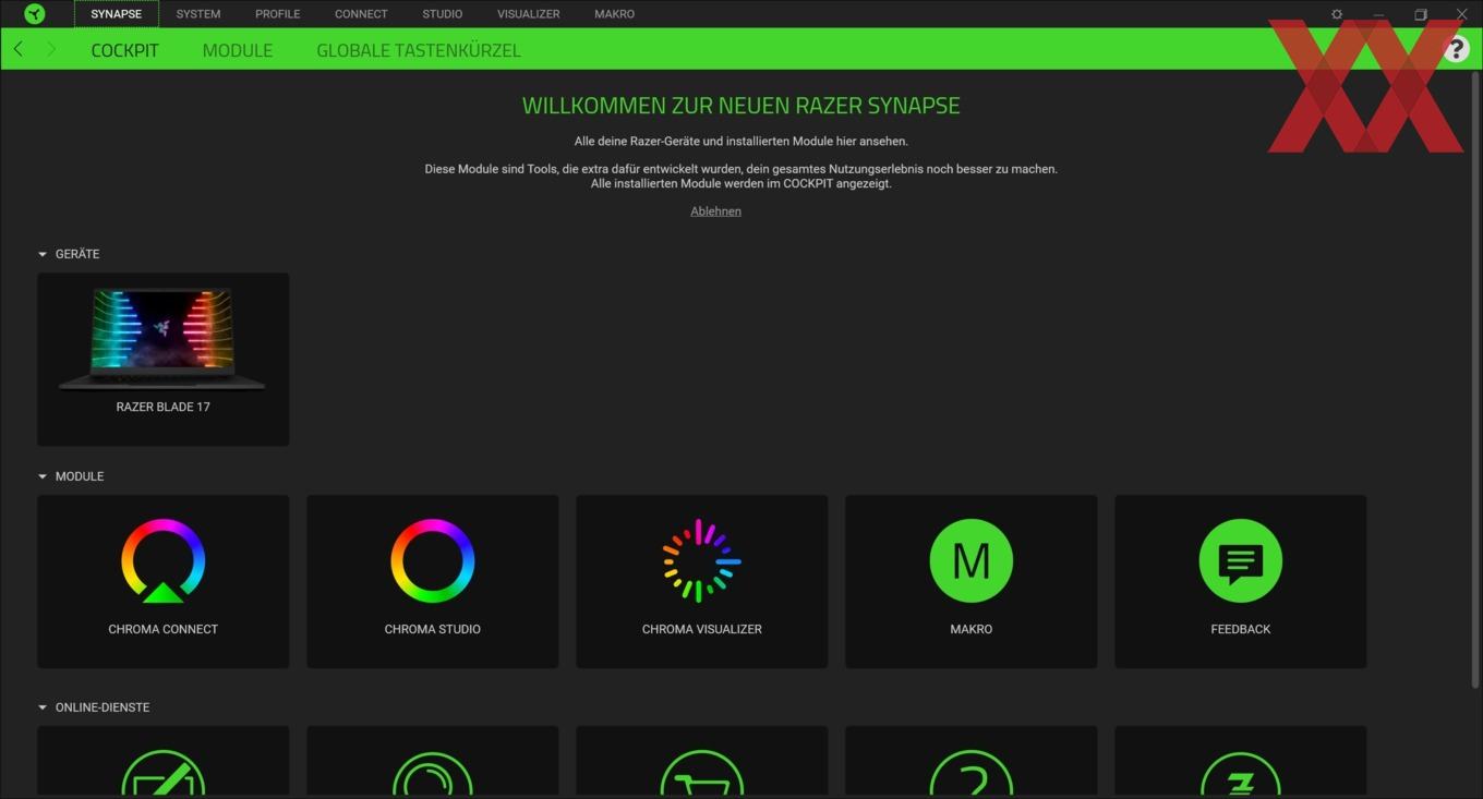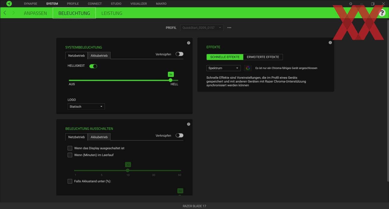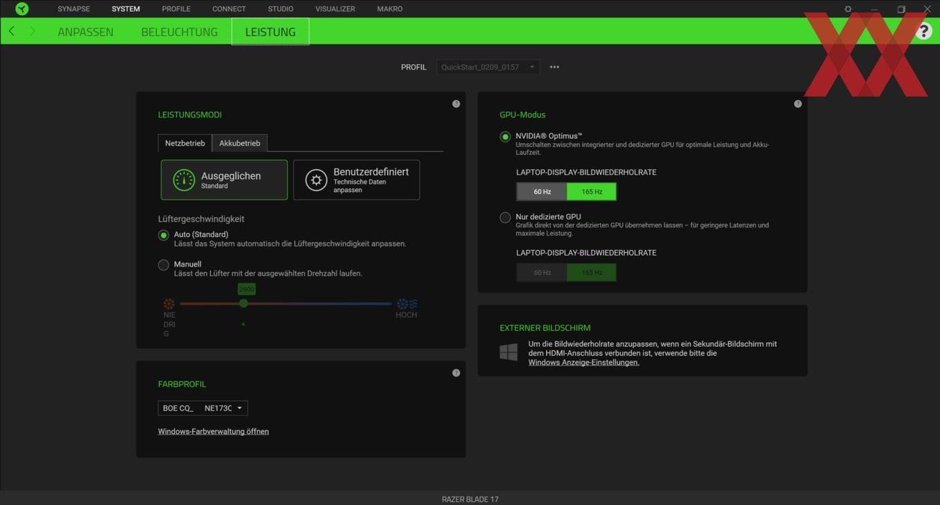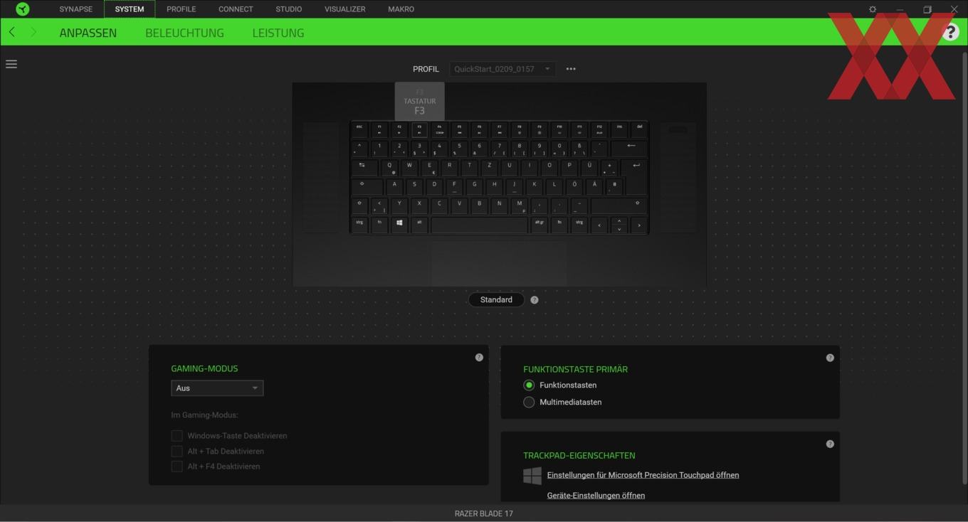 Wie schon bei den bisherigen Blade-Geräten liefert Razer wieder sein Synapse-Tool mit, worüber sich alle wichtigen Systemeinstellungen tätigen oder auslesen lassen. So erlaubt das Tool die Steuerung der RGB-Beleuchtung, die sich nicht nur für jede Taste einzeln konfigurieren, sondern beispielsweise auch für den Akku-Betrieb feinabstimmen lässt. Auch der Leistungsmodus lässt sich justieren, genau wie der automatische Wechsel zwischen integrierter und dedizierter Grafiklösung, wobei dieser mit Blick auf die Laufzeiten bereits ab Werk eingestellt ist.
