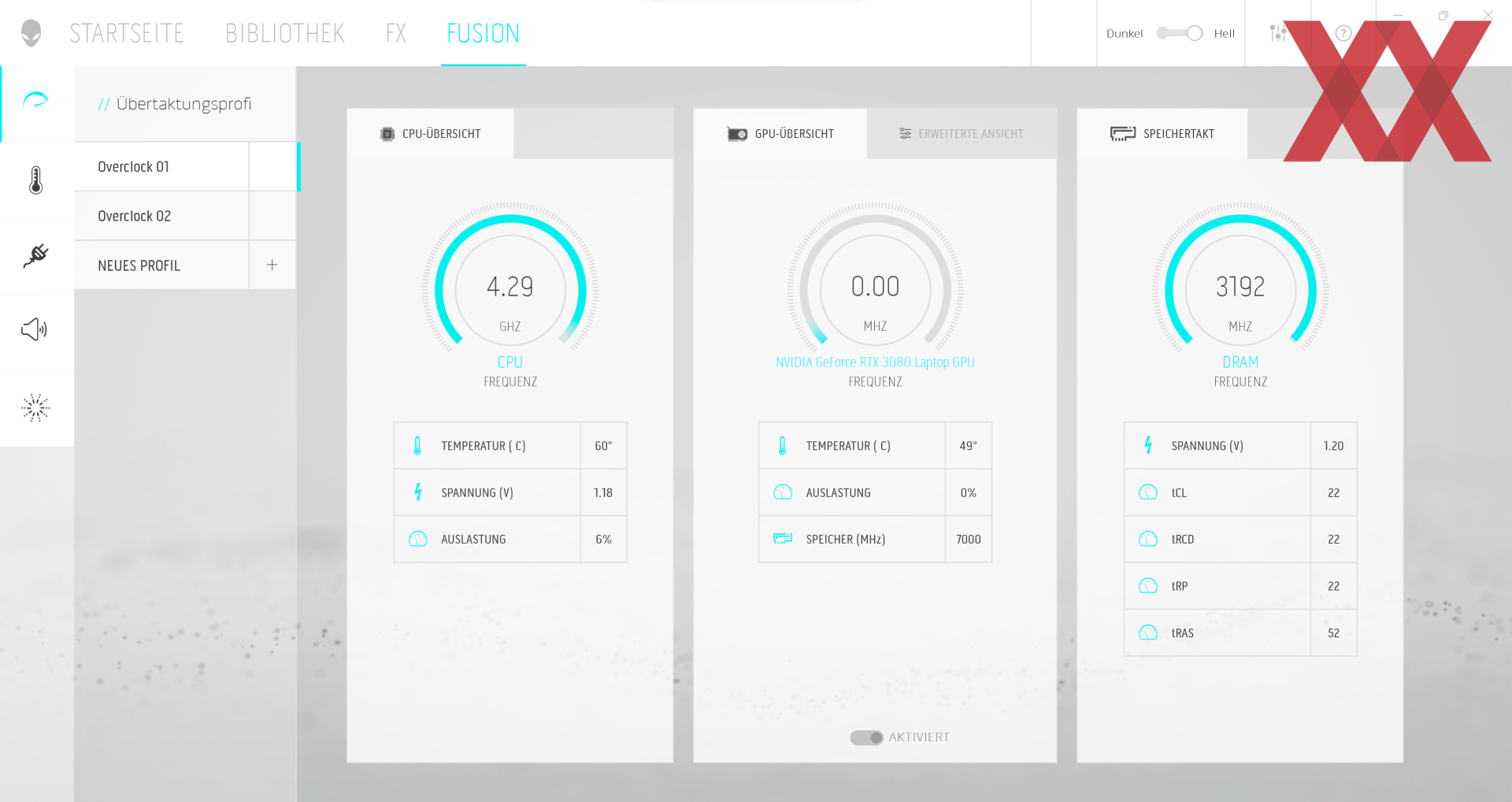 Was die Software anbelangt, so ist das Alienware x17 reichhaltig bestückt. Zwar gibt es einige Demo-Versionen wie für Microsoft Office 365 oder die Sicherheitssoftware von McAfee, dafür gibt es auch einige nützliche Tools. Highlight ist hier das Alienware Command Center, das seinem Namen alle Ehre macht. Denn dieses dient als zentrale Anlaufstelle für alle wichtigen Einstellmöglichkeiten des Notebooks. Es kann nicht nur die Temperatur-Werte von Prozessor und Grafikkarte auslesen, sondern informiert außerdem über die Drehzahlen, die Auslastung und sogar Spannungen. Das RGB-Beleuchtungssystems der Tastatur oder des rückseitigen Leuchtstreifens kann darüber ebenfalls eingestellt werden, genau wie sich Programme schnellstarten lassen. Vorinstalliert ist im Übrigen Windows 11.