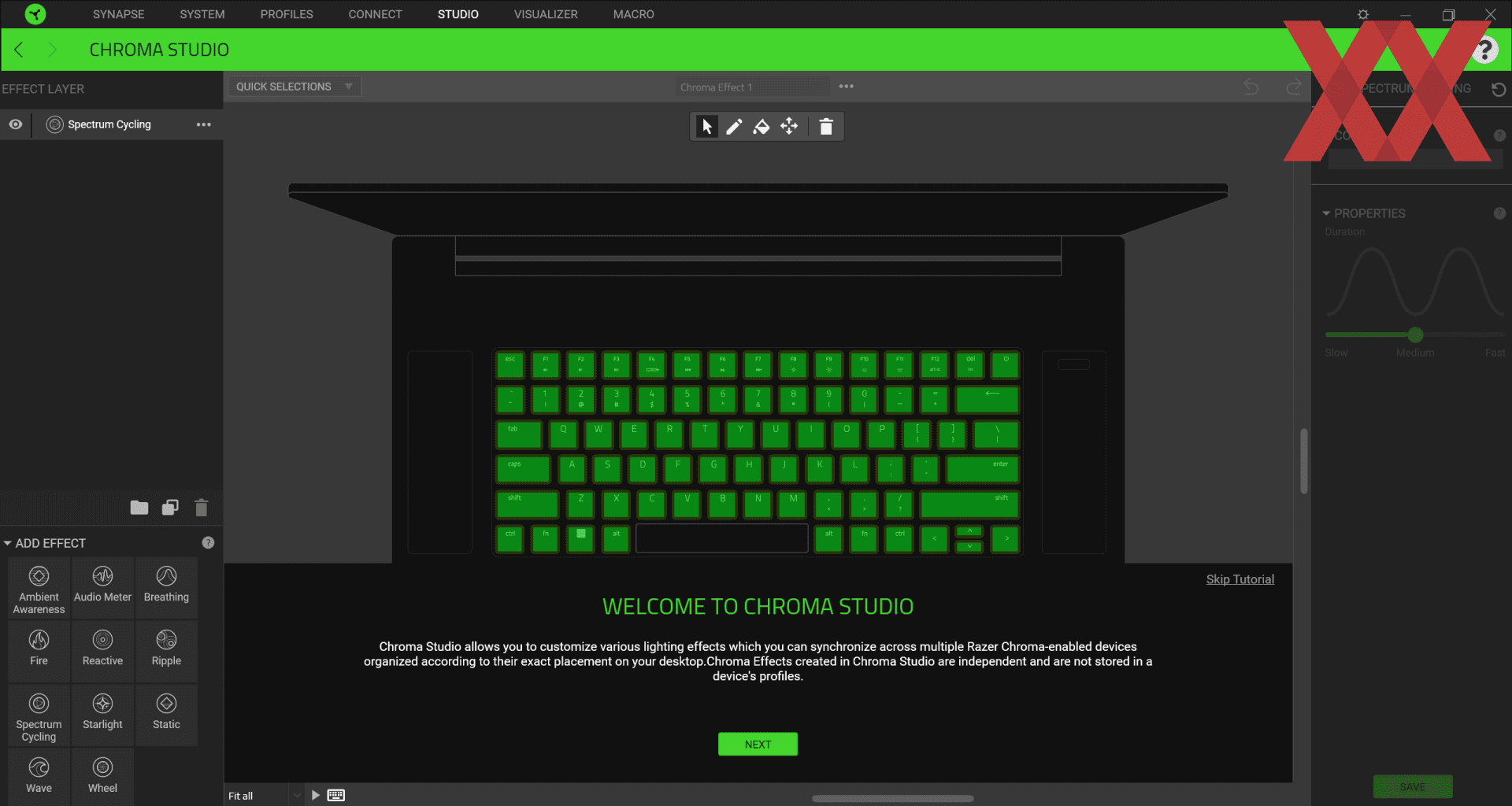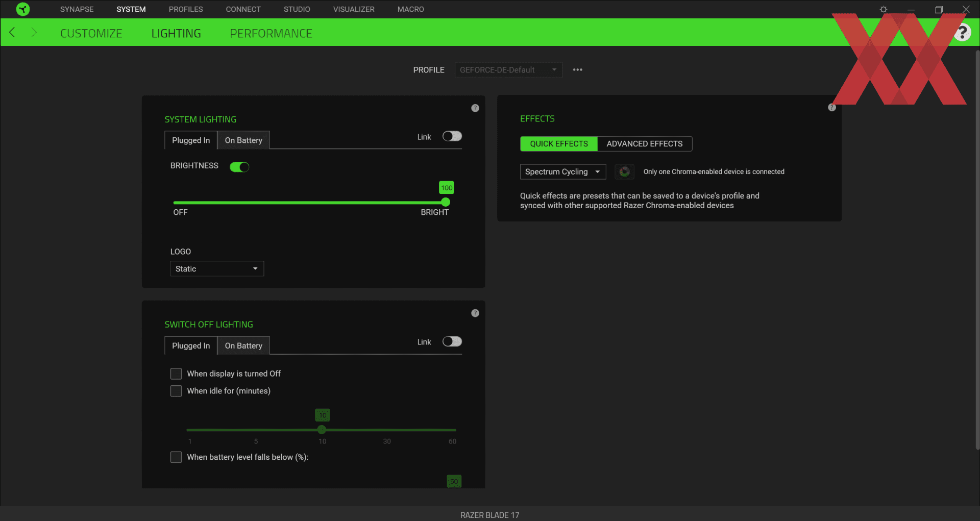 Die Software nimmt außerdem die Konfiguration der Chroma-Beleuchtung vor, macht das sogar für jede Taste einzeln und erlaubt die Konfiguration der Optimus-Technik, was den automatischen Wechsel zwischen der integrierten und dedizierten Grafiklösung anbelangt. Ansonsten lässt sich ein Gaming-Modus aktivieren, bei dem beispielsweise die Windows-Taste oder verschiedene Tastenkombinationen wie Alt + F4 deaktiviert werden, um Fehleingaben beim Spielen zu vermeiden.