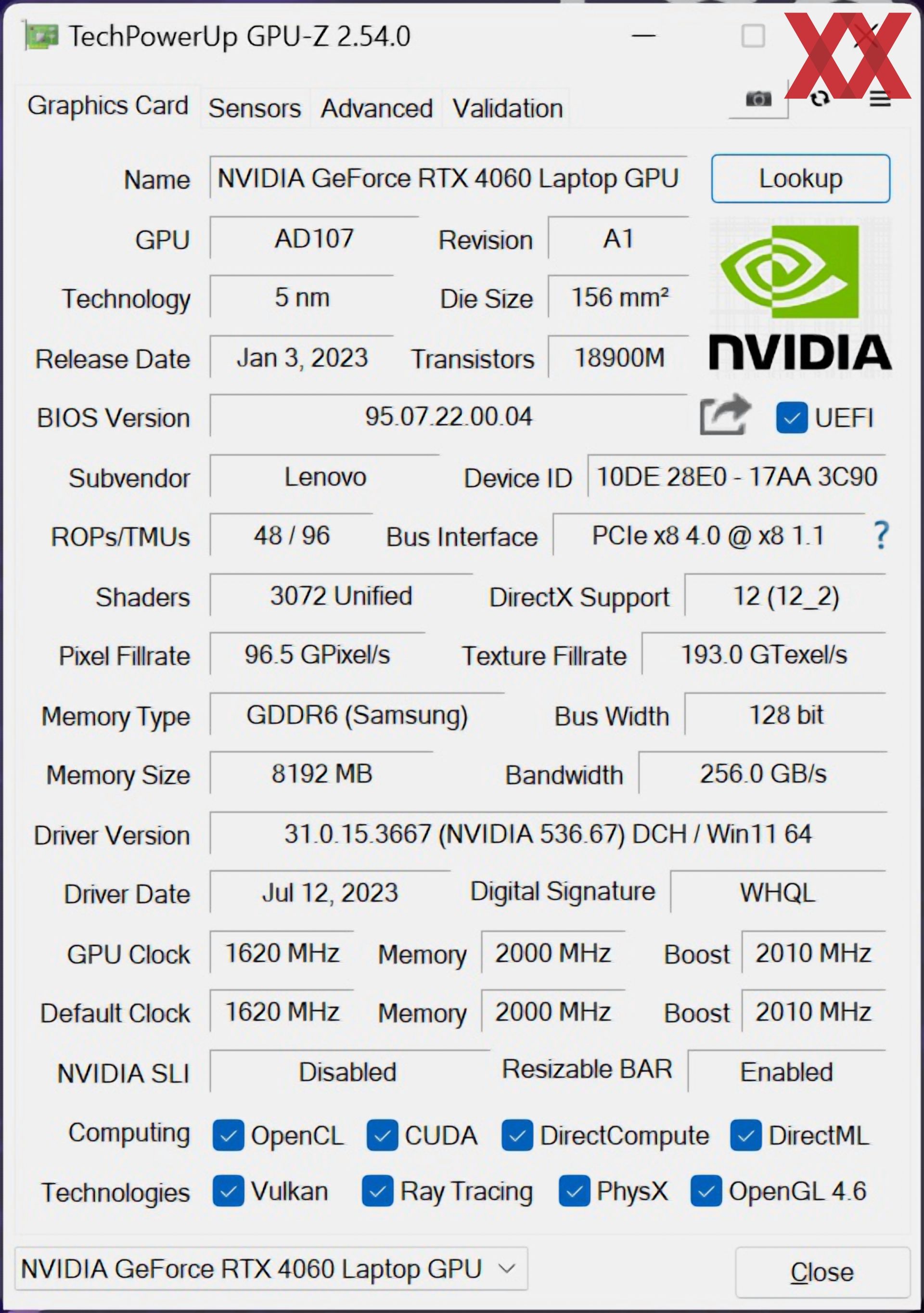 Für Spieler weitaus wichtiger ist die Grafiklösung. Hier gibt es eine NVIDIA GeForce RTX 4060 Laptop mit 8 GB GDDR6-Videospeicher und einem 128 Bit breiten Datenbus, der in Verbindung mit 2.000 MHz eine Bandbreite von 256 GB/s erreichen kann. Die insgesamt 3.072 Shadereinheiten des 18,9 Milliarden Transistoren starken AD107-Chips machen sich mit einem Basis- und Boost-Takt von 1.620, bzw. mindestens 2.010 MHz ans Werk. In der Praxis erreicht unser Testgerät höhere Frequenzen, wie wir später noch feststellen werden.