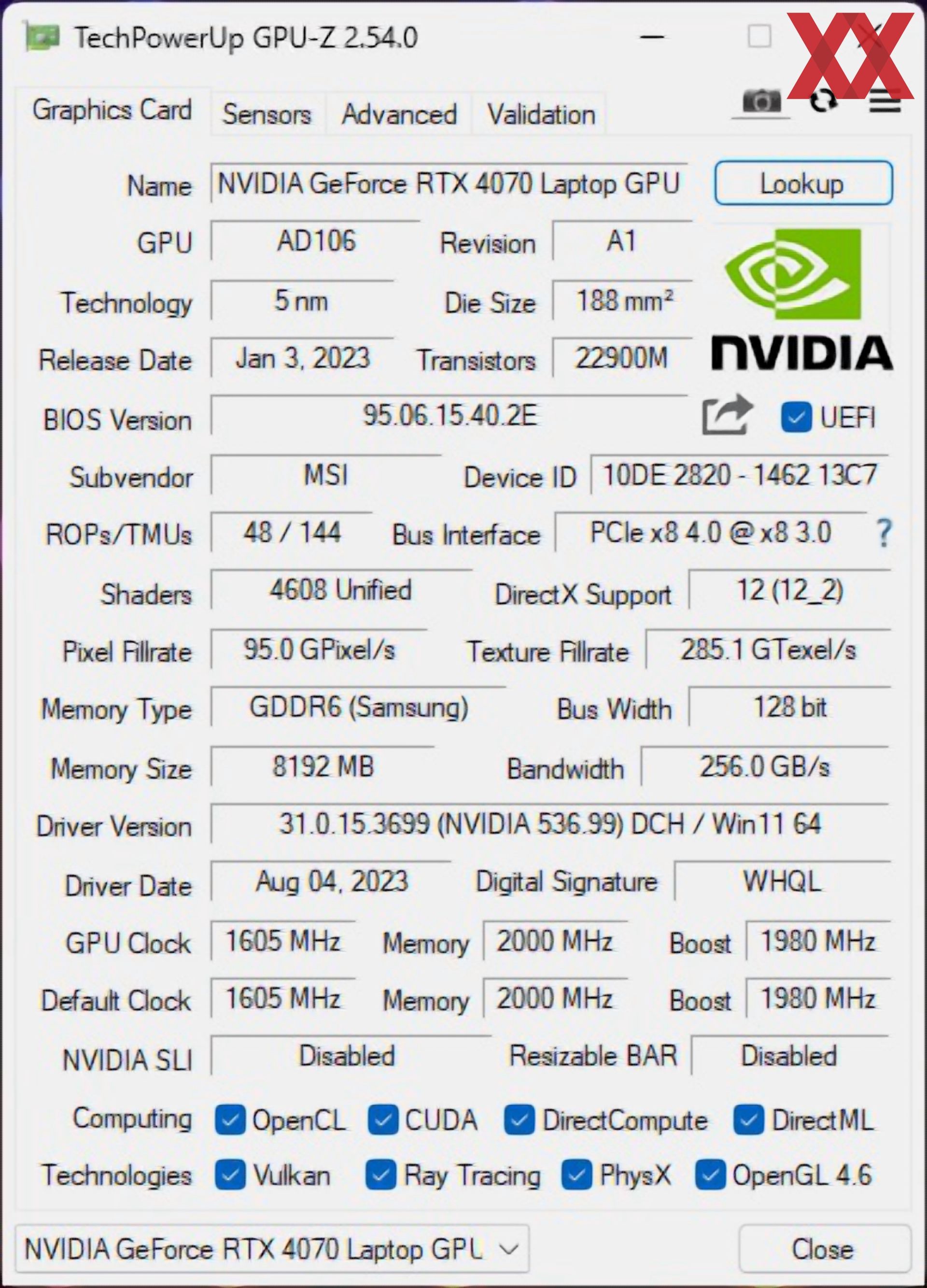 Während bei geringen Grafiklasten die im Alder-Lake-Prozessor integrierte Iris-Xe-Lösung arbeitet, gibt es für Spiele und professionelle Anwendungen eine dedizierte NVIDIA GeForce RTX 4070 Laptop, die auf dem AD106-Chip aufbaut und über 4.608 Shadereinheiten sowie einen 8 GB großen GDDR6-Videospeicher samt einer Anbindung von 128 Bit zurückgreifen kann. Während das Spitzenmodell mit 115 W konfiguriert wird, hat MSI die TGP der Grafiklösung mit Blick auf die kompakten Abmessungen den damit verbundenen Limitierungen bei Kühlung und Stromversorgung abgesenkt. Trotzdem soll im Boost noch ein Takt von mindestens 1.980 MHz erzielt werden können. Bei unserem Testmuster werden in der Praxis sogar über 2.300 MHz erreicht.