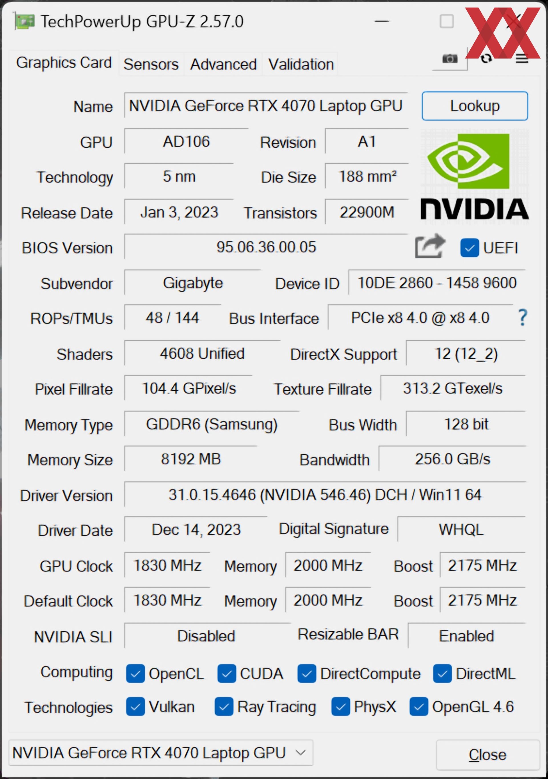 Während das Spitzengerät der Serie mit einer NVIDIA GeForce RTX 4090 Laptop aufwarten kann, ist bei der kleineren 16-Zoll-Variante bei der GeForce RTX 4070 Laptop Schluss. Unser Testmuster ist mit eben dieser ausgestattet. Sie basiert auf dem AD106-Chip und stellt somit 4.608 Shadereinheiten sowie einen 8 GB großen GDDR6-Videospeicher bereit, welcher über einen 128 Bit breiten Datenbus angebunden wird. Gigabyte setzt auf die höchstmögliche TGP-Ausbaustufe und befeuert das Modell mit bis zu 140 W und somit mit dem zusätzlichen Precision Boost 2.0. Damit soll das Modell einen Takt von mindestens 2.175 MHz erreichen können. In der Praxis schafft das Testgerät sogar 2.520 MHz.
