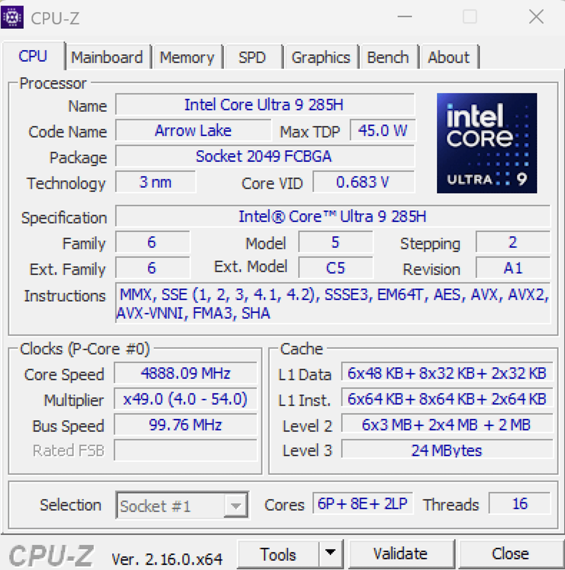 Herzstück des Lenovo Yoga Pro 9 16IAH10 (83L00022GE) ist ein Intel Core Ultra 9 285H auf Arrow-Lake-Basis und damit der bislang schnellste Vertreter der H-Reihe. Er stellt 16 Kerne bereit, die sich aus sechs schnellen Performance-, acht sparsameren Effizienz- sowie zwei besonders energieeffizienten LPE-Cores zusammensetzen. Während die P-Cores einen Takt von bis zu 5,4 GHz erreichen, sind die E-Kerne mit 2,9 GHz langsamer unterwegs. Die Basis-Power liegt bei 45 W, im Boost können kurzzeitig bis zu 115 W erreicht werden. Im ausgewogenen Leistungsmodus sind die PL1- und PL2-Werte mit 115 respektive 80 W konfiguriert, wobei das Gerät in der Spitze kurzzeitig 119,5 W erreicht, ehe es auf die spezifizierten 45 W zurückgeht.