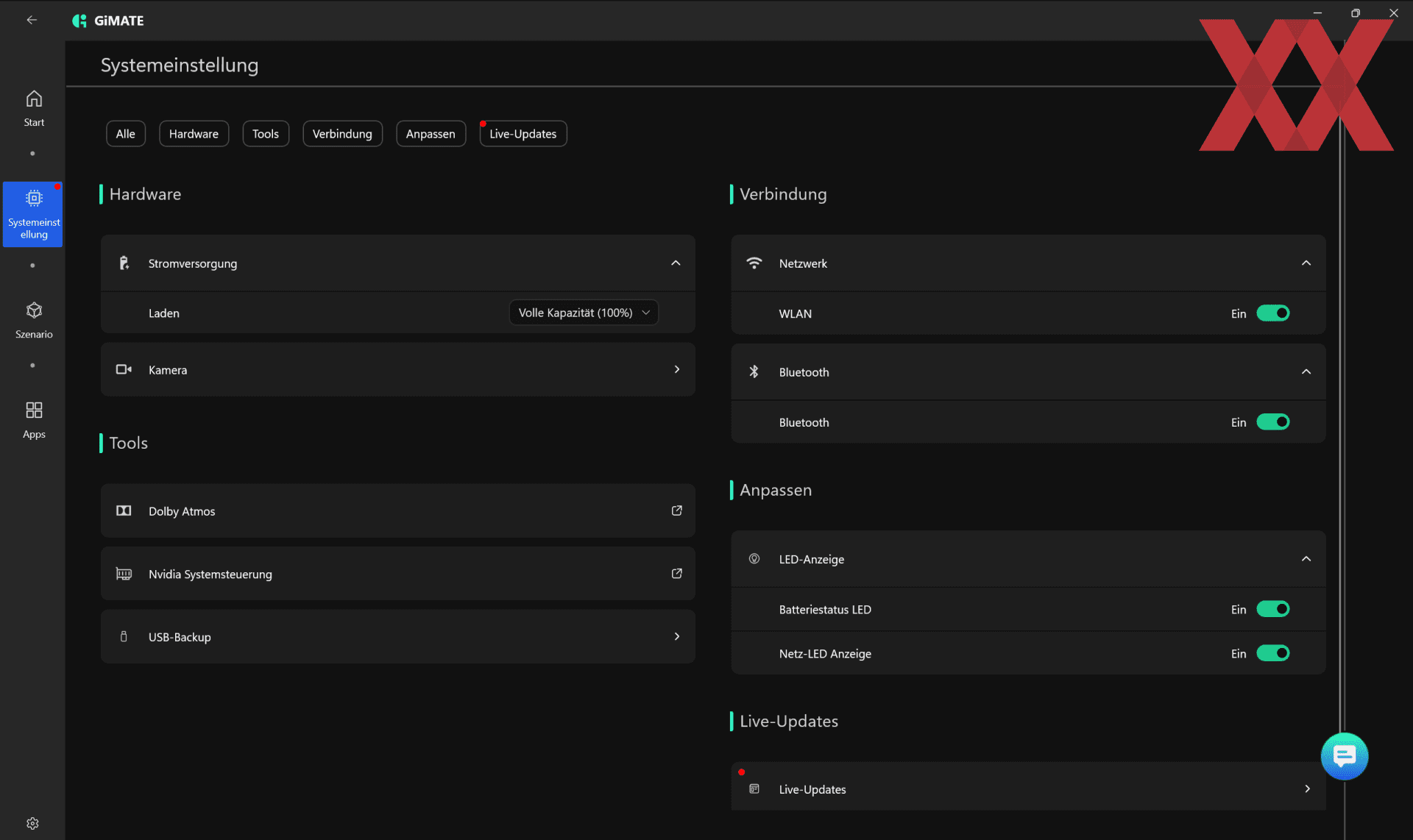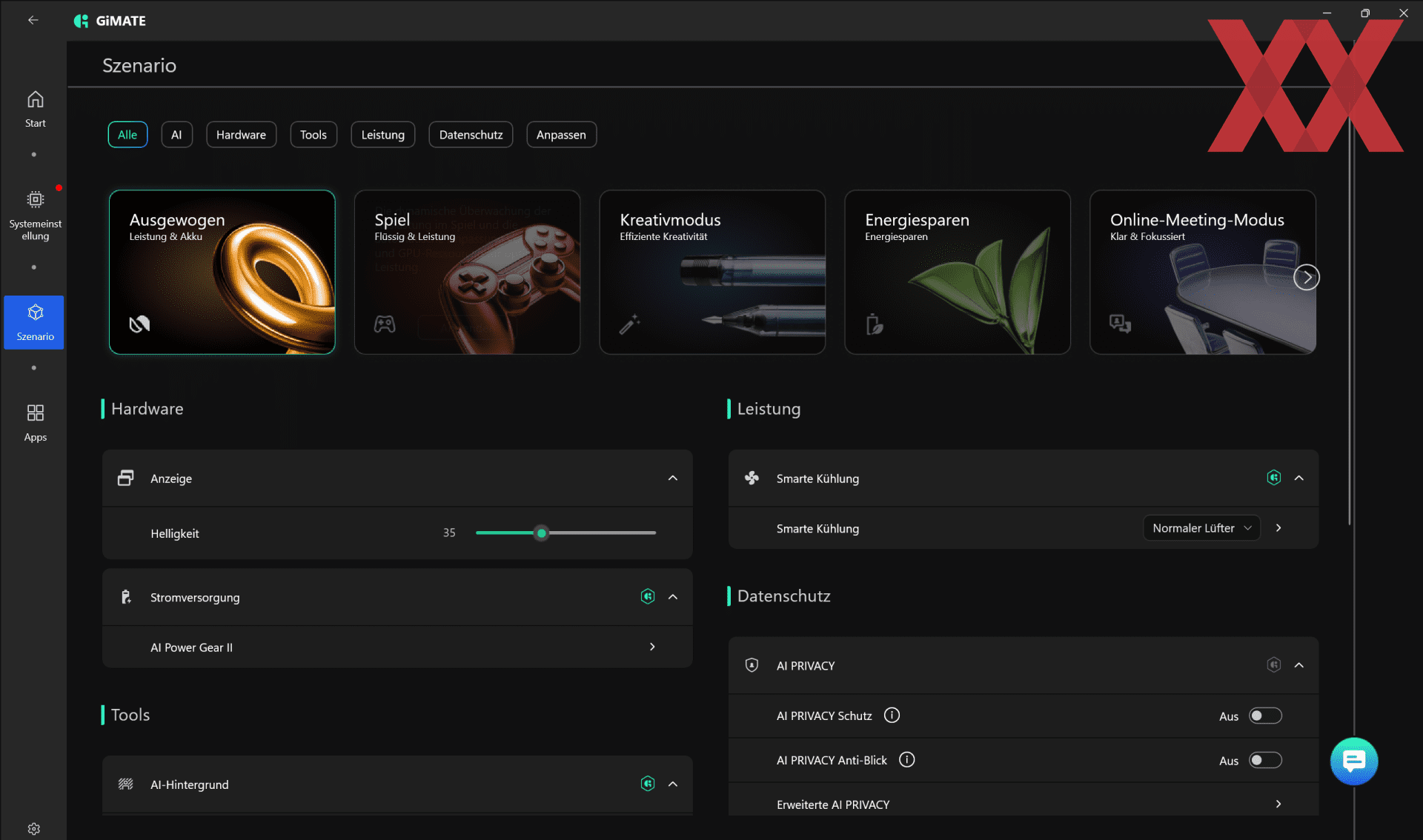 Ansonsten lassen sich über das Tool wichtige Firmware- und BIOS-Updates mit nur wenigen Klicks automatisch einspielen, die Status-LEDs konfigurieren, das Ladeszenario für den integrierten 76-Wh-Akku einstellen und die RGB-Hintergrundbeleuchtung der Tastatur festlegen. Verschiedene Szenarien, welche Einfluss auf die Lautstärke und Leistung haben, können ebenso gewählt wie deren automatische Steuerung per AI-Funktion aktiviert werden. Im Akku-Modus wird beispielsweise auch die CPU auf maximal 65 W gedrosselt, was sich bei Spitzenlasten durchaus bemerkbar macht.