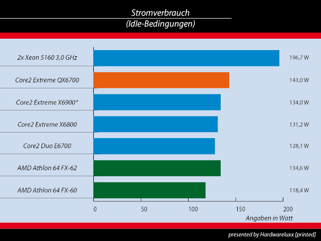 Knapp 60 Watt mehr sind es hier im Vergleich zu einem X6800 - das entspricht ziemlich genau dem Verbrauch eines Conroe-Kernes. Dafür ist der Core2 Extreme QX6700 aber auch deutlich schneller - und er verbraucht immer noch weniger als ein Athlon 64 FX-62, der eine sehr viel schlechtere Performance liefert. In sofern geht der Stromverbrauch noch in Ordnung.