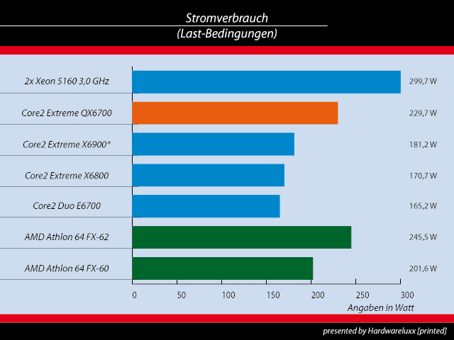 Unter Last packt der Core2 Extreme dann - bei allerdings höherer Performance - deutlicher zu: