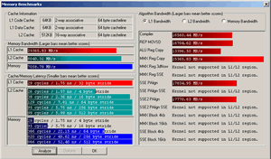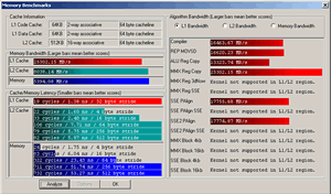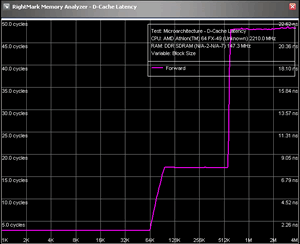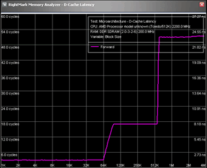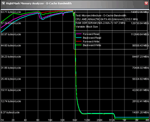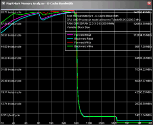 Da AMD an der Anbindung der Caches nichts geändert hat, verändert sich auch nicht die Bandbreite, die für den Datentransfer zur Verfügung steht. Sehr gut zu sehen ist hier, dass der AMD Athlon 64 X2 64 kb L2-Cache und 512 kb L2-Cache besitzt (die beiden "Einbrüche").