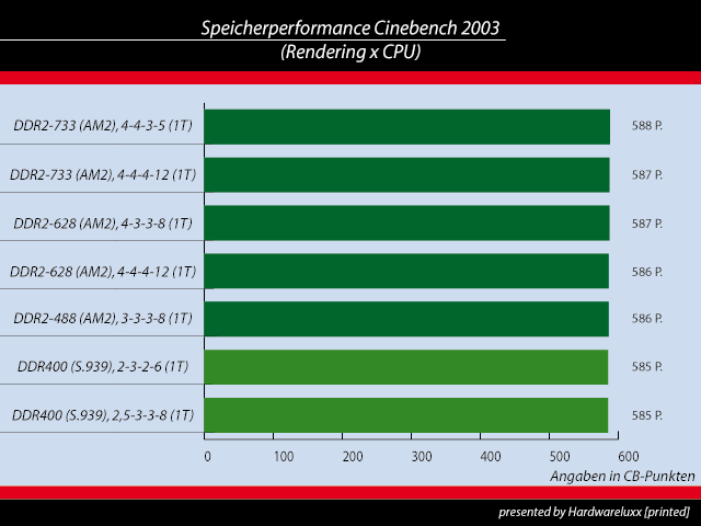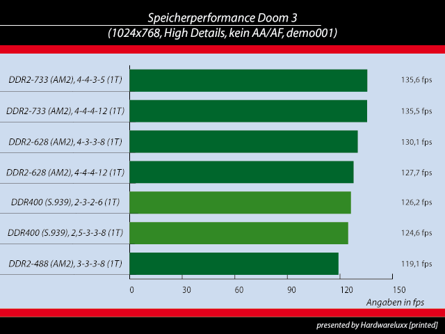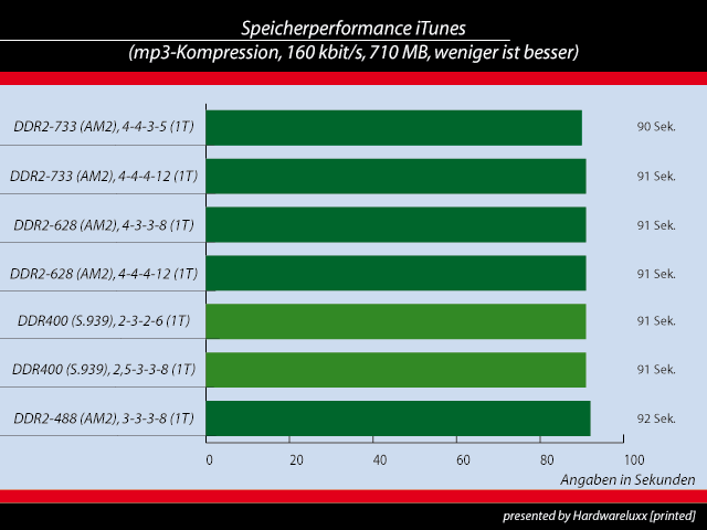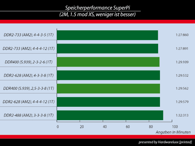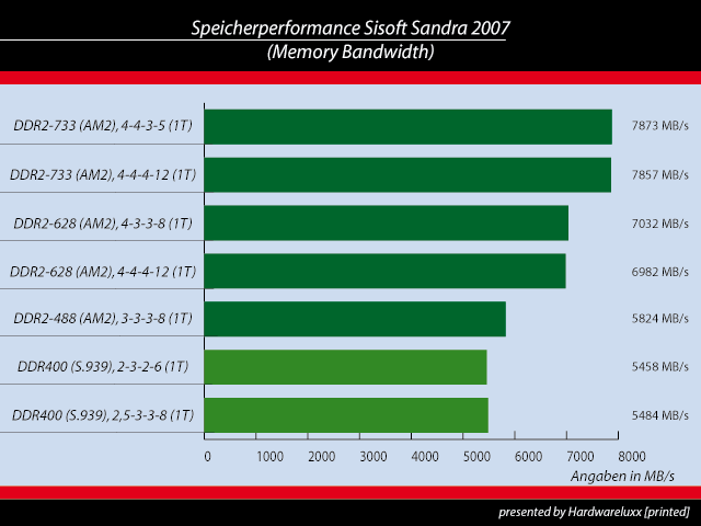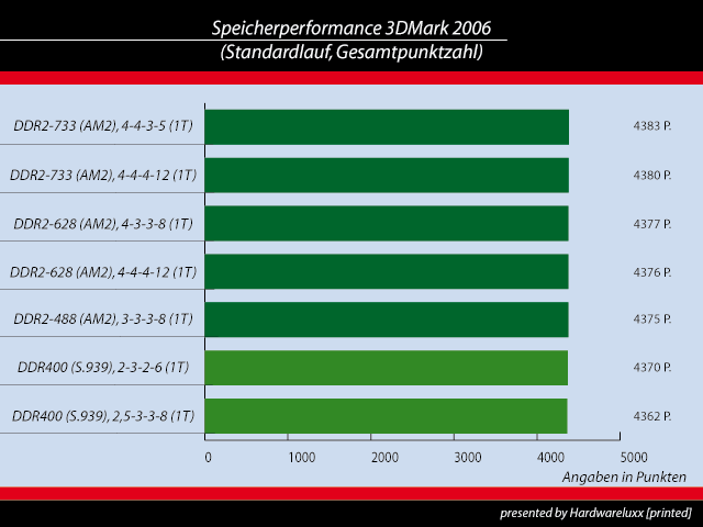 Wie man sehen kann, lag das AM2-System meistens vor dem älteren Sockel-939-System - nur mit DDR2-533-Einstellung (also nur 488 Mhz Speichertakt) muss das AM2-System das DDR400-System ab und zu vorbeiziehen lassen. In vielen Benchmarks liegt das AM2-System mit 4-4-4-12 und 1T Command mit 667 MHz Speichertakt (hier real DDR2-628) ungefähr auf demselben Niveau wie ein DDR400-System mit 2-3-2-6 und einer Command Rate von 1T.