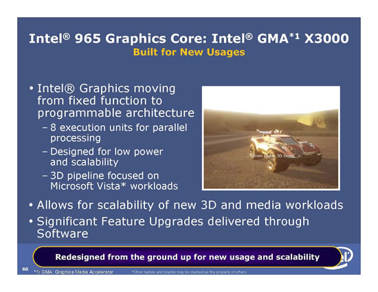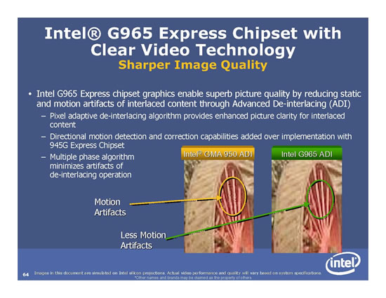Interessant wird die Grafik vor allen Dingen durch einen uneingeschränkten Vista-Support. Damit ist man selbst mit einer integrierten Grafik in der Lage, sämtliche DX9c- und Vista-Features wie die Aero-Oberfläche genießen zu können. Zudem kann Intel die Execution-Units auch für Videoplayback und mpeg-Beschleunigung nutzen. Unter Intels Clear Video Technology findet man diverse Features, die zum einen das Videoplayback beschleunigen sollen (z.B. HD Decode, Windows Media Unterstützung, MPEG-2 HW-Beschleunigung), aber auch Funktionen, die die Bildqualität verbessern. Zum einen bietet die GMA X3000 Advanced Deinterlacing-Features, zum anderen hat man aber auch Farbverbesserungsoptionen eingebaut. Letztendlich besitzt Sie Support für HDMI.