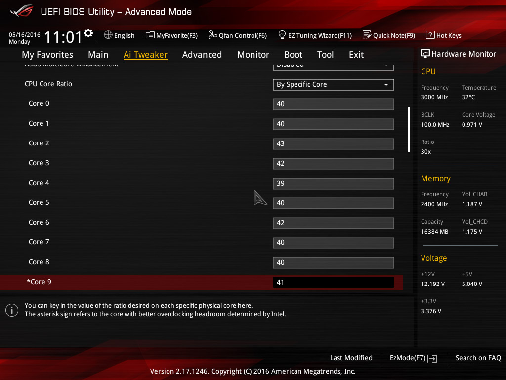 Mit dem Core i7-6950X und auch den anderen Broadwell-E-Prozessoren erlaubt Intel nun eine genauere Einstellung für jeden Kern. So kann Kern 0 fix auf 4.000 MHz gestellt werden, während Kern 1 auf 4.200 MHz läuft und Kern 2 auf 4.400 MHz betrieben wird - und so weiter. Wer sich also die Mühe machen will, die maximalen Taktraten eines jeden Kerns auszuloten, kann anschließend deren Maximaltakt fest einstellen.