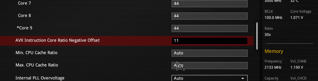 Oftmals wird ein Kern dabei nicht instabil, weil alle Recheneinheiten nicht mehr stabil laufen, sondern weil Teile der CPU nicht mehr bei dem hohen Takt ordentlich funktionieren. In der Vergangenheit war oft der AVX-Teil des Prozessors der problematische Part. Intel bietet es nun an, nicht nur den Cache-Takt separat einzustellen, sondern auch den AVX-Takt als Offset für den Kern-Takt einzustellen. Wählt man hier die Einstellung "1", läuft der AVX-Takt der Kerne jeweils 100 MHz unterhalb der Kerntaktung.