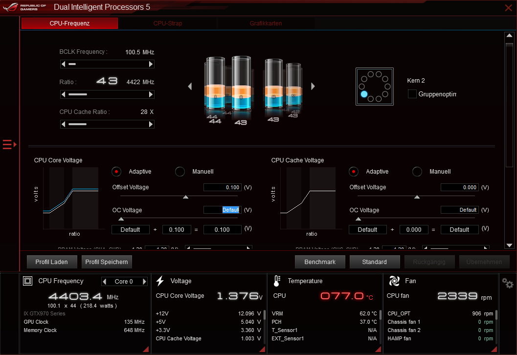 Während CPU-Z und andere Tools meistens die Taktfrequenz von Core 0 anzeigen, liefert ASUS AI Suite 3 eine Ansicht, bei der man sich die Taktraten einer CPU unter Last getrennt voneinander ansehen kann. Dort waren die im BIOS eingestellten Werte zu erkennen - und die Benchmarks reagierten auch auf eine entsprechend höhere oder niedrigere Einstellung.
