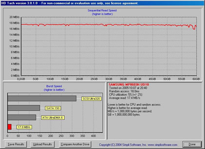Wie beim Sequential Read Speed zu erkennen ist, konnte keine Datenübertragung mit mehr als 18 MB/s erreicht werden, der Burst Speed bestätigt dieses mit einem Durchschnittswert von 17,8 MB/s. Die durchschnittlicher Zugriffszeit von 18 Millisekunden ist weder schlecht noch gut und auch teilweise durch die Festplatte begrenzt.
