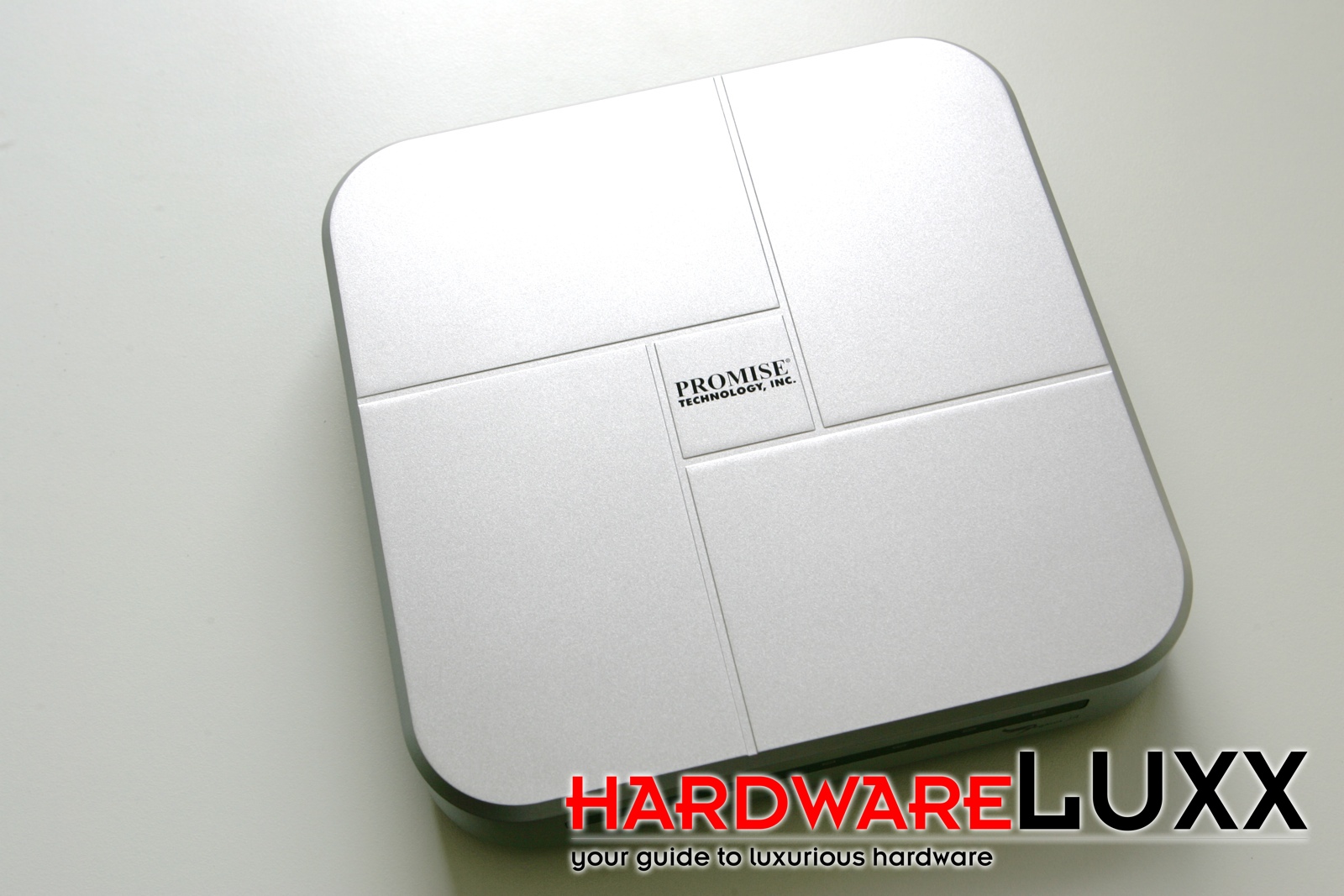 Promise bewirbt das Pegasus J4 als idealen Begleiter zum Mac mini, was sich an anhand der Abmessungen von etwa 20 cm für Breite und Tiefe sowie der Höhe von 3 cm festmachen lässt. Beim Gehäuse setzt Promise, wie auch LaCie, auf Aluminium. Bereits im Design des Top-Covers deutet Promise den Einsatz von vier HDDs an. Das Gewicht liegt bestückt bei 2,4 kg.