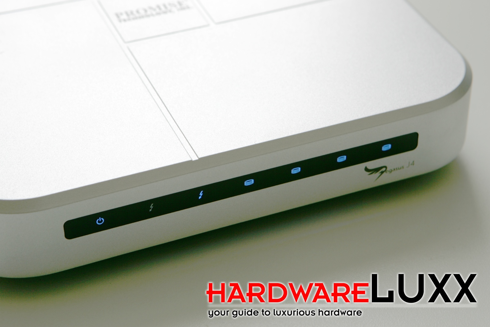 Auf der Vorderseite des Promise J4 werden alle wichtigen Informationen an den Nutzer gegeben. Die linke LED zeigt den Betriebszustand an. Daneben wird angezeigt, welcher der beiden Thunderbolt-Anschlüsse verwendet wird. Auf welche Festplatte gerade zugegriffen wird, zeigen die weiteren vier LEDs an.
