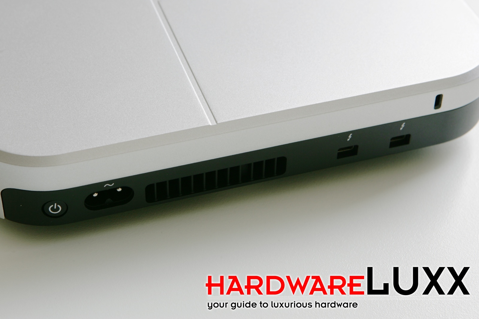 Auf der Rückseite zu finden ist ein Ein/Ausschalter, der Anschluss für das Netzteil sowie die beiden Thunderbolt-Ports. Auch hier besteht die Möglichkeit für den Aufbau einer Daisy-Chain, in der mehrere Thunderbolt-Geräte hintereinandergeschaltet werden. Zwischen den Anschlüssen ist die Öffnung für die Lüftung zu sehen. Sehr gut hat uns an dieser Stelle gefallen, dass das Pegasus J4 über ein internes Netzteil verfügt. Somit entfällt die Platzierung eines lästigen externen Blocks.