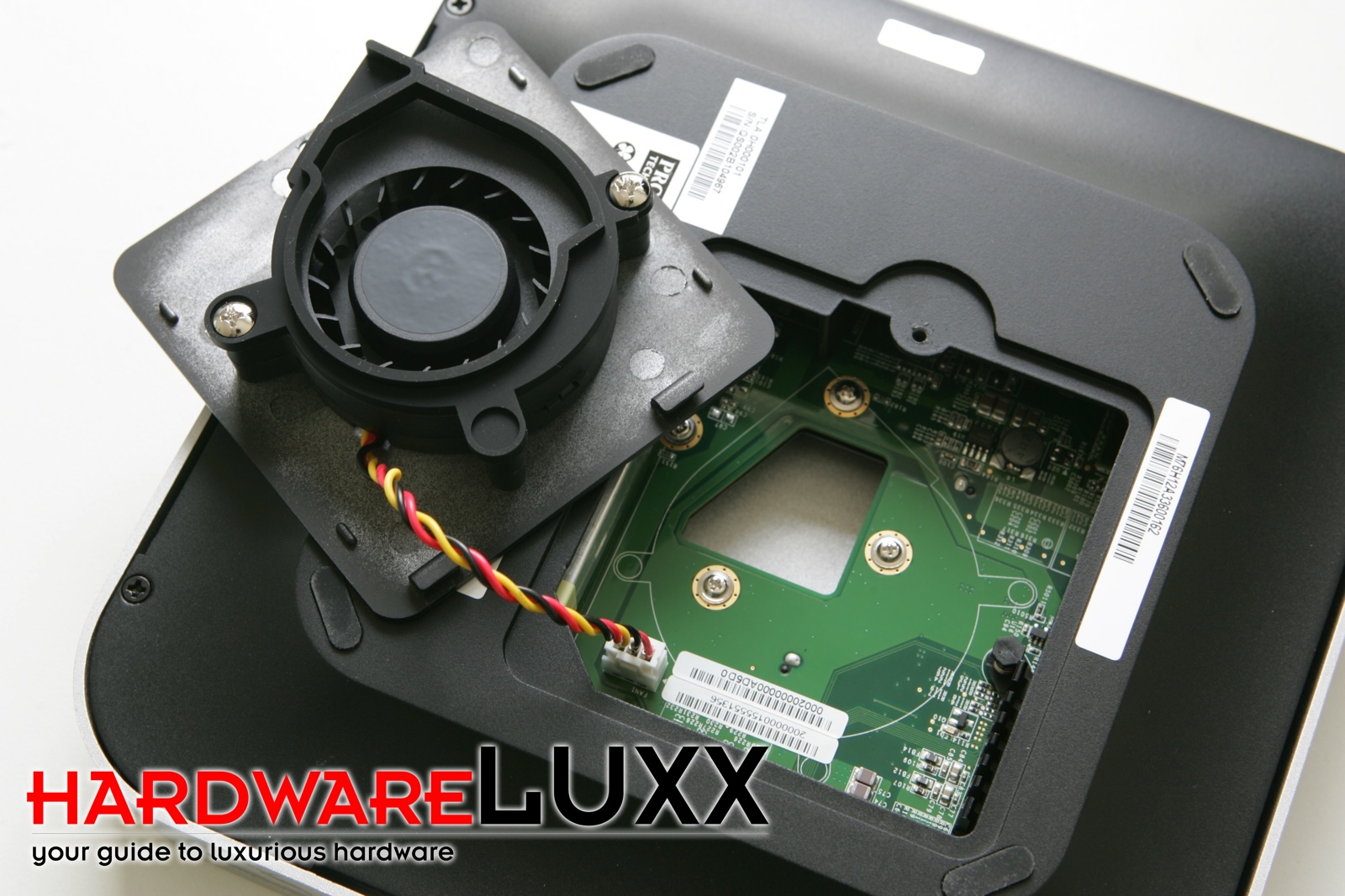 Anders als beim LaCie 5big bietet das Promise Pegasus J4 keinen direkten Zugang zu den Festplatten. Dafür kann der Lüfter leicht herausgenommen werden, vermutlich, um diesen reinigen zu können. Darunter ist ein PCB zu sehen, auf dem die elektrischen Komponenten untergebracht sind. Auf einen RAID-Chip verzichtet auch Promise und bindet die vier Platten über die Thunderbolt-Schnittstelle auf PCI-Express-Ebene an.