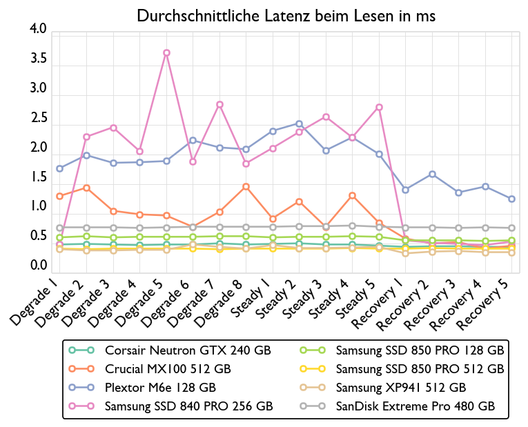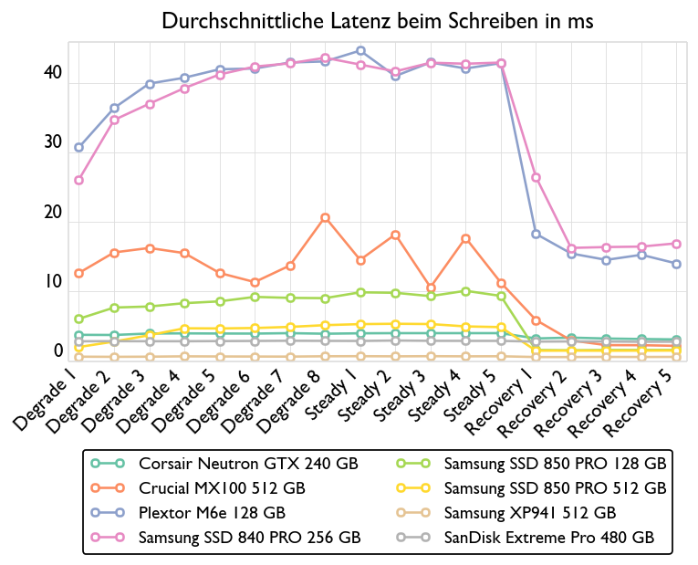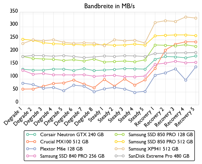 Die SanDisk Extreme PRO schneidet in diesem Test hervorragend ab. Die Grundperformance wird praktisch unabhängig von der Belastung des Laufwerks gehalten, die zur Extreme PRO gehörenden Messpunkten bilden nahezu eine gerade Linie. Die Crucial MX100 mit gleicher Kapazität fällt bei Belastung sehr weit hinter die Extreme PRO und kann diese erst während der Erholungsphase wieder einholen.