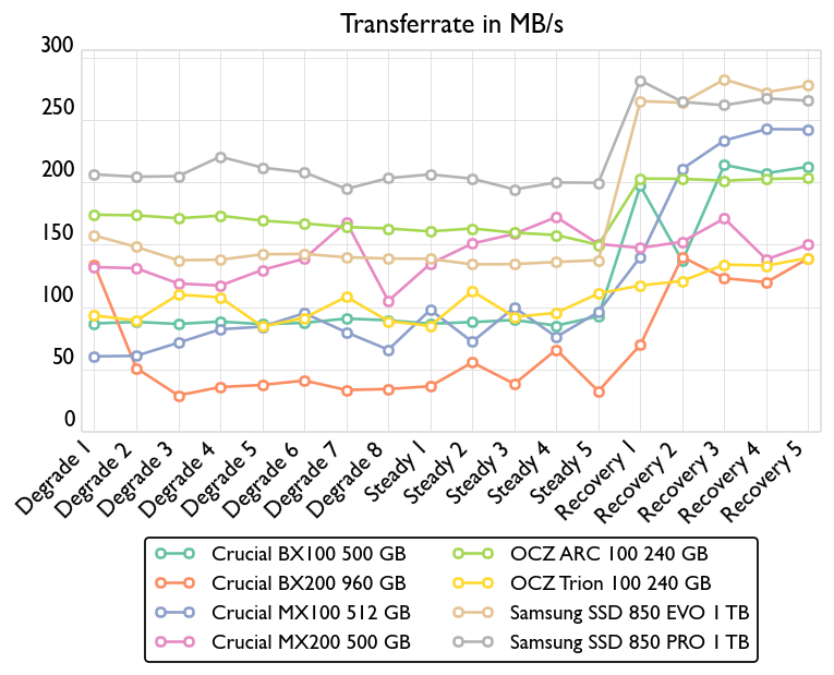 Das Vorgehen von PCMark 8 ist deutlich näher am Alltag: In der ersten Phase wird das Laufwerk zweimal komplett gefüllt, wobei der zweite Durchlauf sicherstellen soll, dass auch der dem Nutzer nicht zugängliche Speicher gefüllt wird. In der zweiten Phase (Degrade) wird das Laufwerk insgesamt achtmal hintereinander mit zufälligen Schreibzugriffen belastet, wobei der erste Durchgang 10 Minuten dauert und jeder weitere Durchlauf fünf Minuten länger. Nach jedem Durchgang wird die Performance gemessen. In der dritten Phase (Steady state) finden fünf weitere Durchläufe mit jeweils 45 Minuten Schreibdauer statt, auch hier wird die Performance gemessen. In der letzten Phase (Recovery) wird nach einer Leerlaufzeit von fünf Minuten die Performance gemessen. Diese Messung wird inklusive der Leerlaufzeit fünfmal wiederholt und soll dem Laufwerk die Möglichkeit geben, sich zu regenerieren.