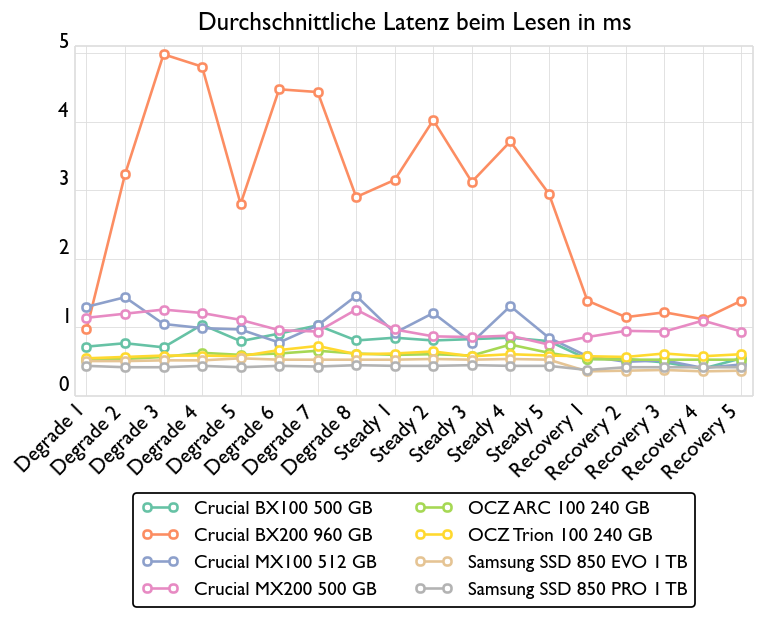 Während der Belastungsphase ist die Lese- und Schreiblatenz der Crucial BX200 deutlich erhöht. Während der Erholungsphase sinken die Latenzen wieder deutlich, liegen aber immer noch über denen der Vergleichs-SSDs. Insbesondere hat der Vorgänger Crucial BX100 hier ein deutlich besseres Ergebnis geliefert. Bei der Gesamtbewertung der Performance zeigt sich ein ähnliches Bild.