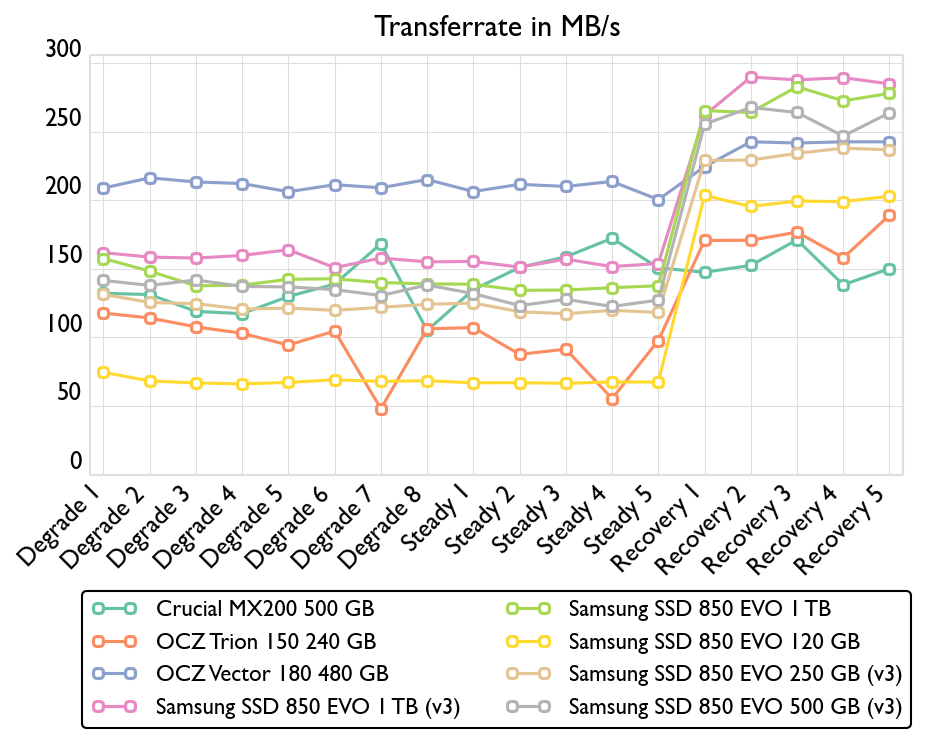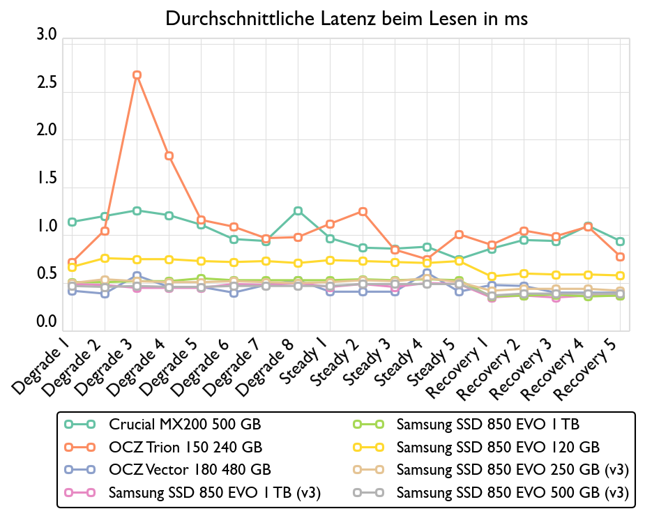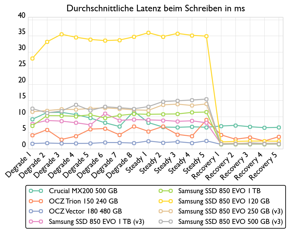 Während die OCZ Vector 180 bei diesem Test relativ gleichbleibende Werte und damit ein hervorragendes Ergebnis liefert, verliert die Samsung SSD 850 EVO unter starker Last an Performance. Am deutlichsten fällt das bei der kleinsten Version mit 120 GB auf, deren Gesamtleistung stark einbricht, wobei gleichzeitig die Latenz beim Schreiben stark zunimmt. Im direkten Vergleich der 1-TB-Variante schneidet die neue Version der 850 EVO besser ab als die alte.