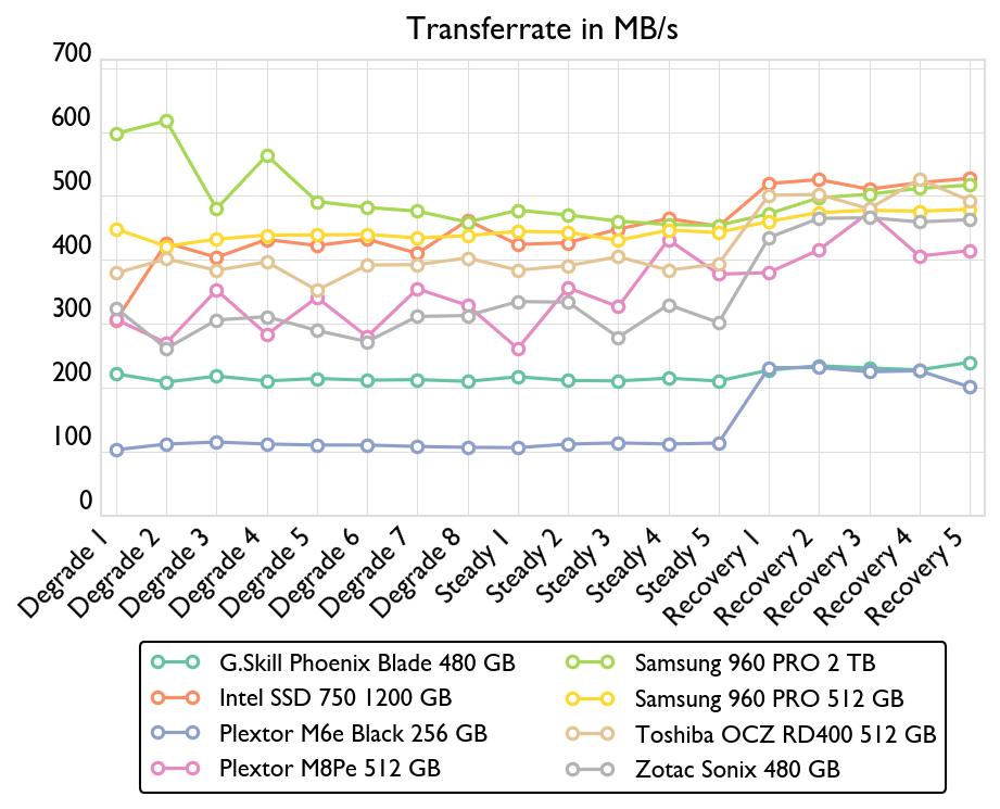 Das Vorgehen von PCMark 8 ist deutlich näher am Alltag: In der ersten Phase wird das Laufwerk zweimal komplett gefüllt, wobei der zweite Durchlauf sicherstellen soll, dass auch der dem Nutzer nicht zugängliche Speicher gefüllt wird. In der zweiten Phase (Degrade) wird das Laufwerk insgesamt achtmal hintereinander mit zufälligen Schreibzugriffen belastet, wobei der erste Durchgang 10 Minuten dauert und jeder weitere Durchlauf fünf Minuten länger. Nach jedem Durchgang wird die Performance gemessen. In der dritten Phase (Steady state) finden fünf weitere Durchläufe mit jeweils 45 Minuten Schreibdauer statt, auch hier wird die Performance gemessen. In der letzten Phase (Recovery) wird nach einer Leerlaufzeit von fünf Minuten die Performance gemessen. Diese Messung wird inklusive der Leerlaufzeit fünfmal wiederholt und soll dem Laufwerk die Möglichkeit geben, sich zu regenerieren.