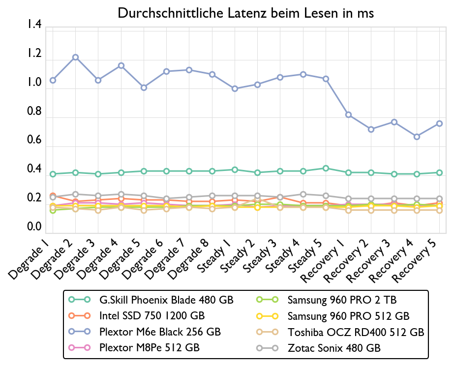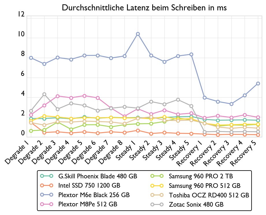 Im direkten Vergleich zum Vorgänger liefert die Plextor M8Pe hier ein wesentlich besseres Ergebnis. Verglichen mit anderen aktuellen PCI-Express-Laufwerken sind die Latenzen beim Schreiben jedoch etwas erhöht, die Gesamtleistung fällt unter extremer Belastung ebenfalls recht stark ab, sodass die Laufwerke von Toshiba und Intel wieder schneller sind - im Neuzustand war dies umgekehrt.