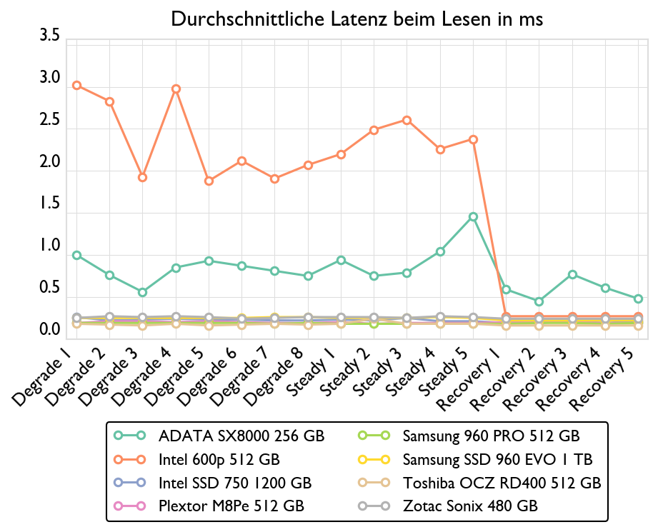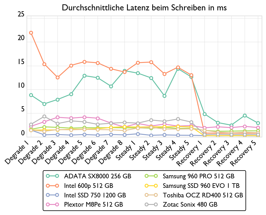 Obwohl ADATA den besseren und schnelleren Speicher verwendet, scheint Intel die Firmware für sein Laufwerk soweit optimiert zu haben, dass auch große Belastungen keinen andauernden negativen Einfluss auf die Performance des Laufwerks haben. Die Kapazität der getesteten Laufwerke ist allerdings auch nicht identisch, bei gleicher Kapazität dürfte sich das Ergebnis noch etwas zugunsten der SX8000 verschieben.