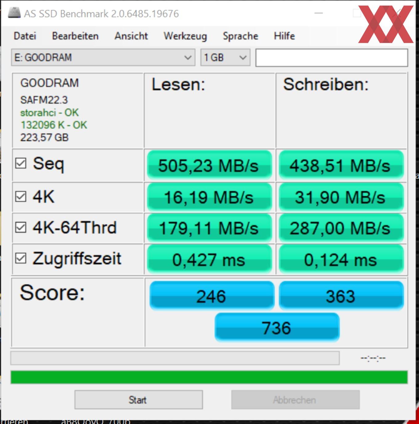 Im AS SSD Benchmark kann sich die GoodRAM Iridium Pro gut im Mittelfeld platzieren. Hier kann man auch gut sehen, dass sich der von GoodRAM und einigen anderen Herstellern verwendete Phison P3110-S10 Controller keine Blöße gibt. Grobe Ausreißer oder andere Anomalien gab es während des Tests der GoodRAM Iridium Pro nicht.