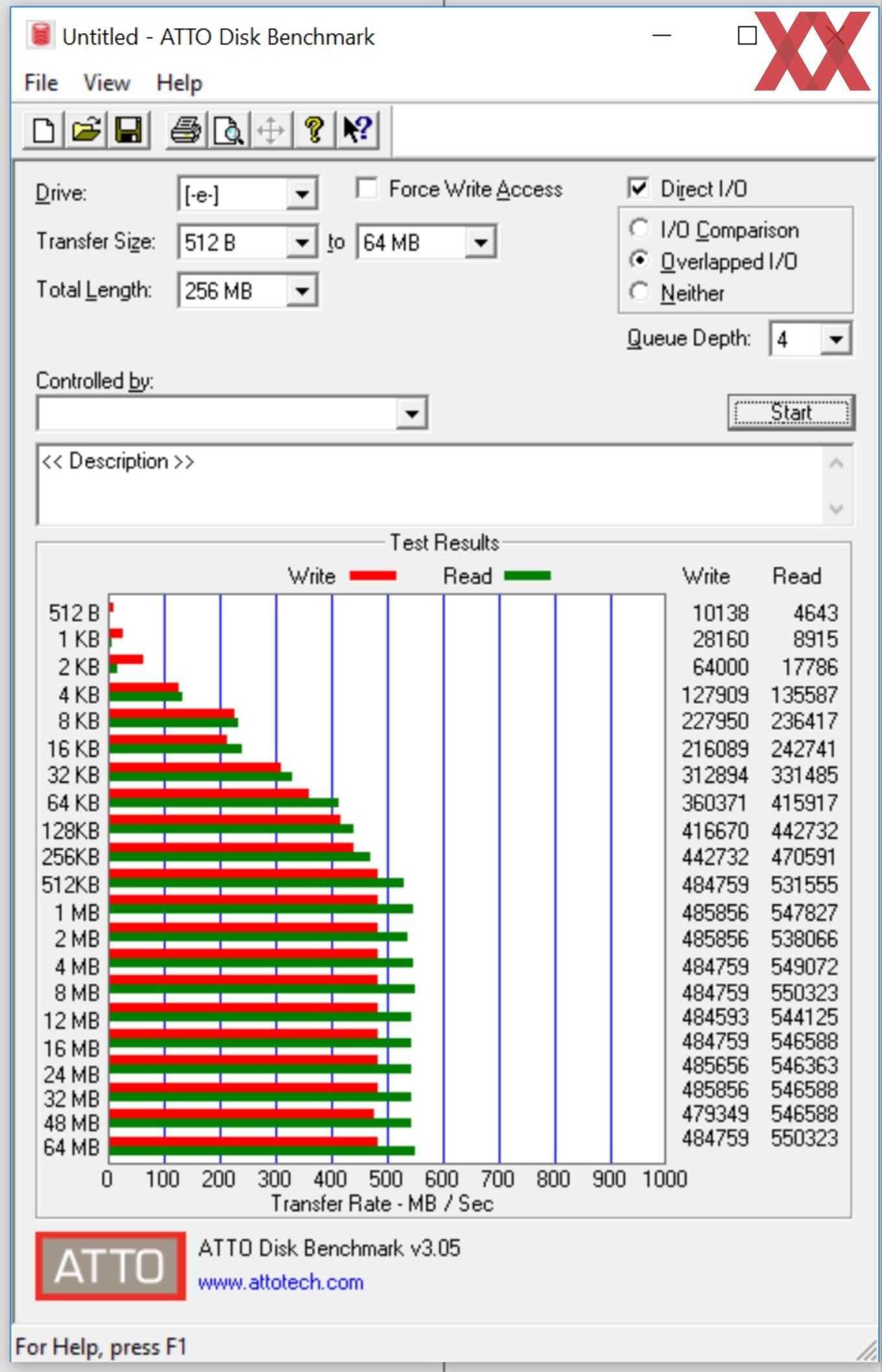 Keine Überraschungen gibt es auch hier beim ATTO-Benchmark. Dort werden Ergebnisse geliefert, die so zu erwarten waren.