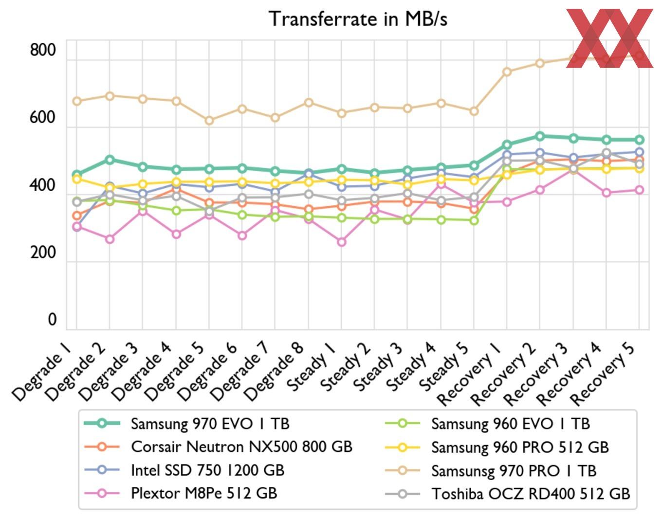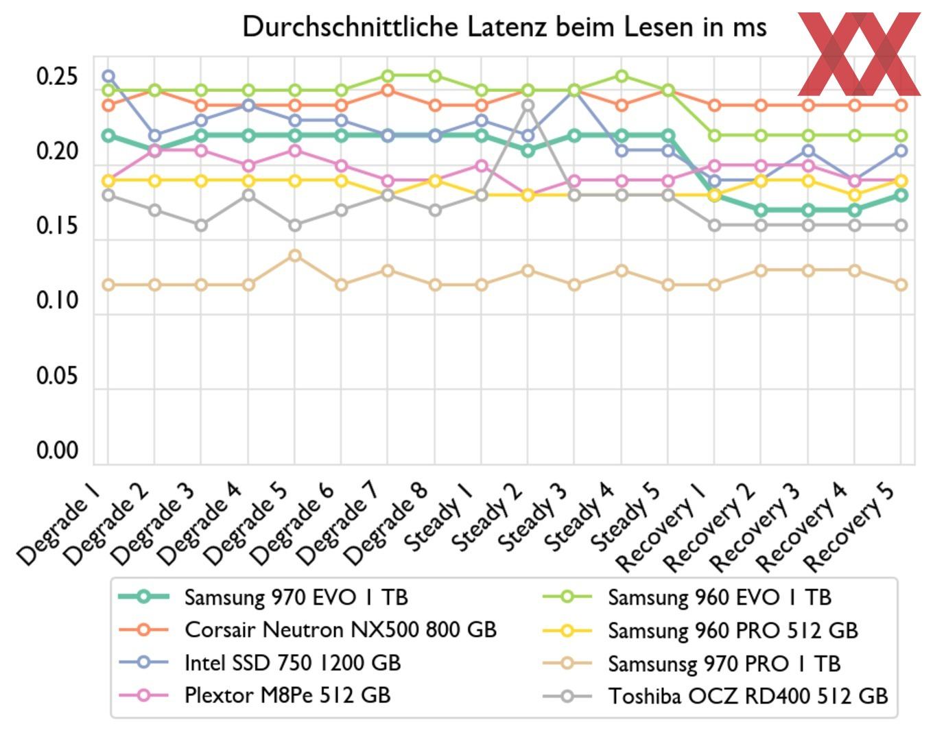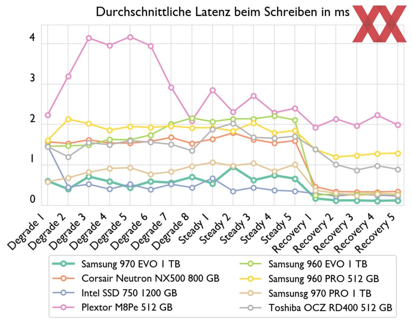 Bei den Latenzen schneidet die SSD 970 EVO besser als ihre Vorgängerin ab, wenn auch nicht im gleichen Umfang. So sind die Fortschritte beim Lesen eher von geringer Natur, beim Schreiben wurde die Reaktionszeit je nach Testsequenz in etwa halbiert. Der Blick auf die Transferraten offenbart ebenfalls eine kleine, aber dennoch erkennbare Verbesserung. Denn während die 960 EVO während von Degrade-Phase zu Degrade-Phase immer geringere Werte erreichte, verliert das neue Modell weit weniger Tempo. Im Gegenzug fällt der Sprung beim Wechsel in die Recovery-Phase weit kleiner aus.