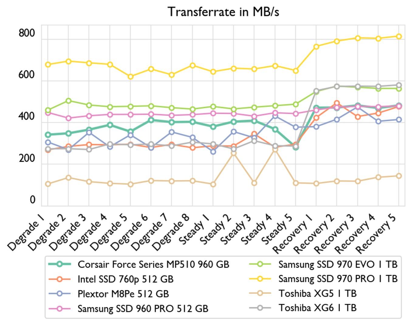 Das führt aber dennoch dazu, dass die Force Series MP510 960 GB nicht uneingeschränkt empfohlen werden kann. Denn der versprochenen sehr guten Haltbarkeit und der hohen Leistung steht das Risiko gegenüber, dass Temperatur oder Schreiblast früher als bei der Konkurrenz zum Problem werden können. Zwar sind die entsprechenden im Test aufgedeckten Schwachpunkte aufgrund der Messungen eher theoretischer Natur, dennoch hat manch andere SSD bei unter gleichen Bedingungen besser abgeschnitten.