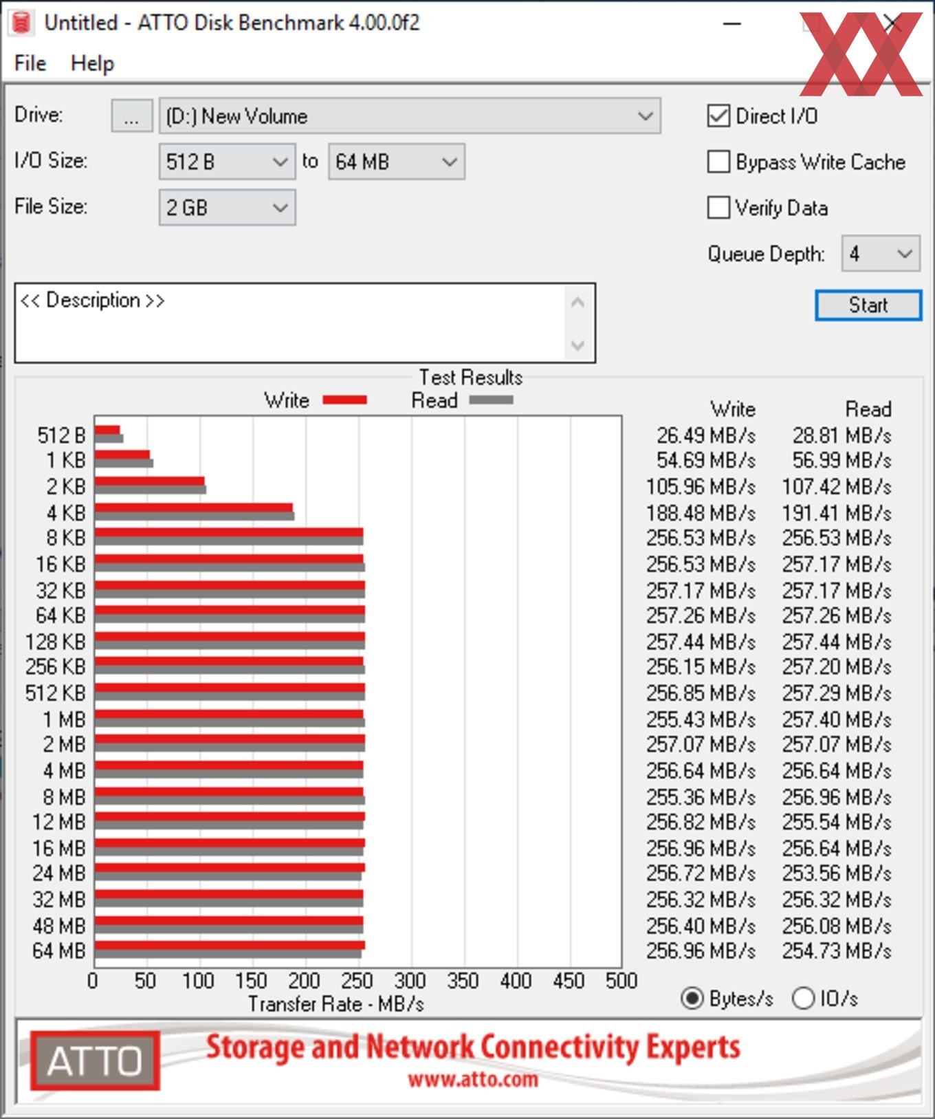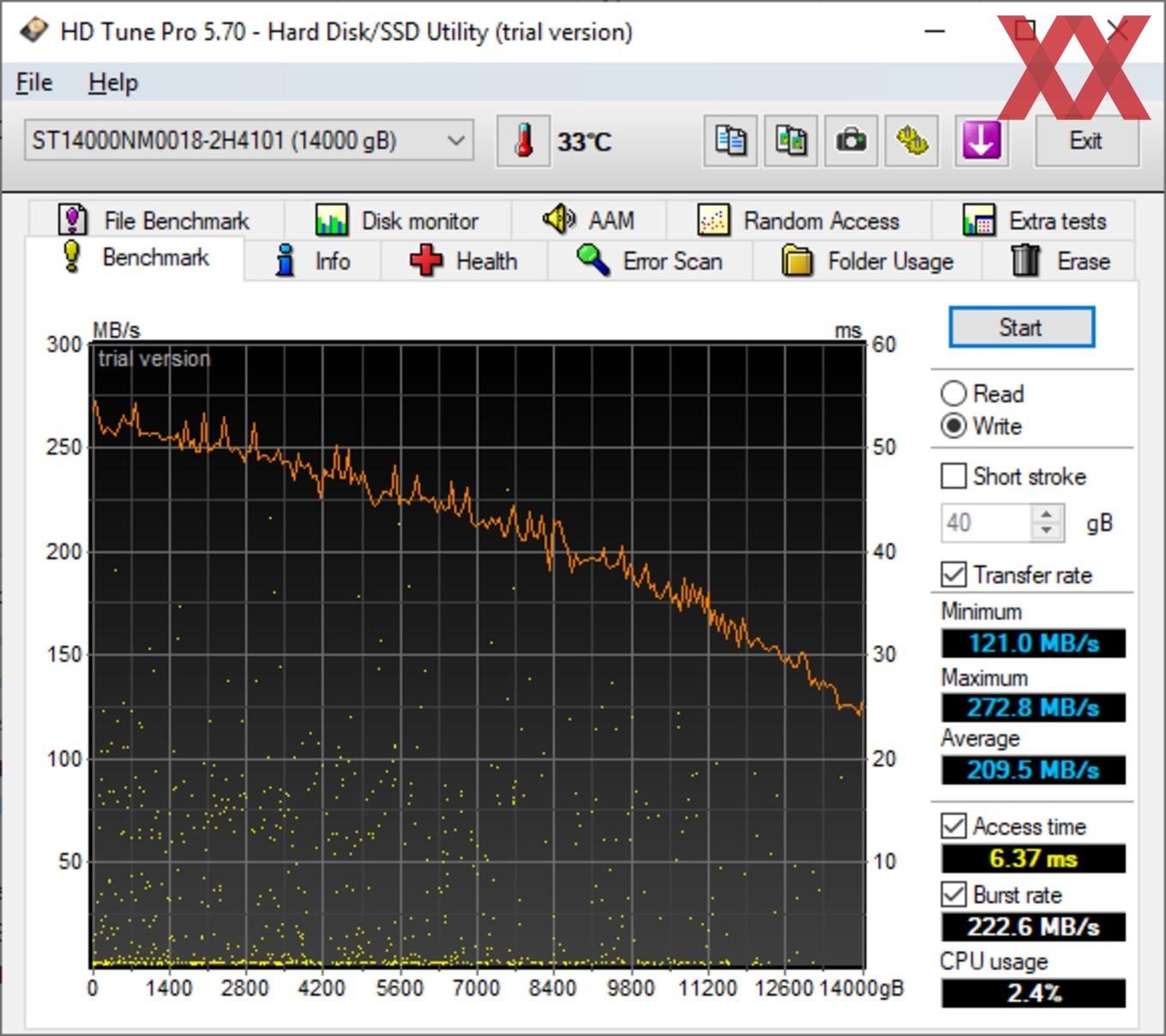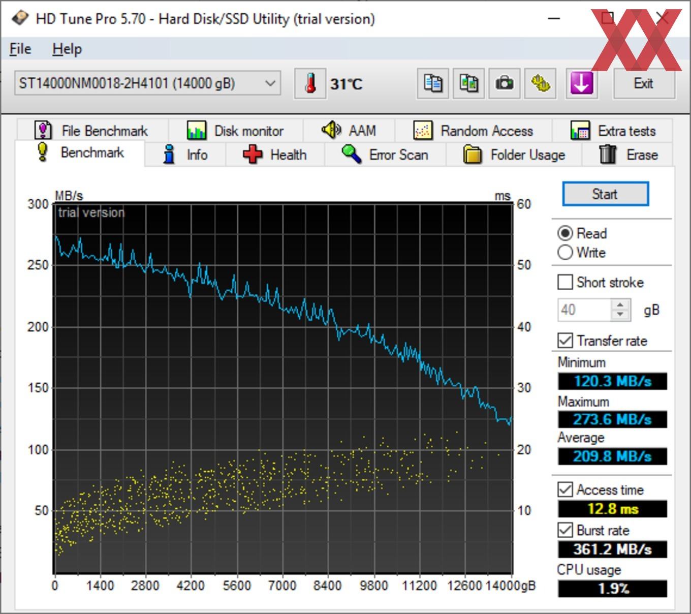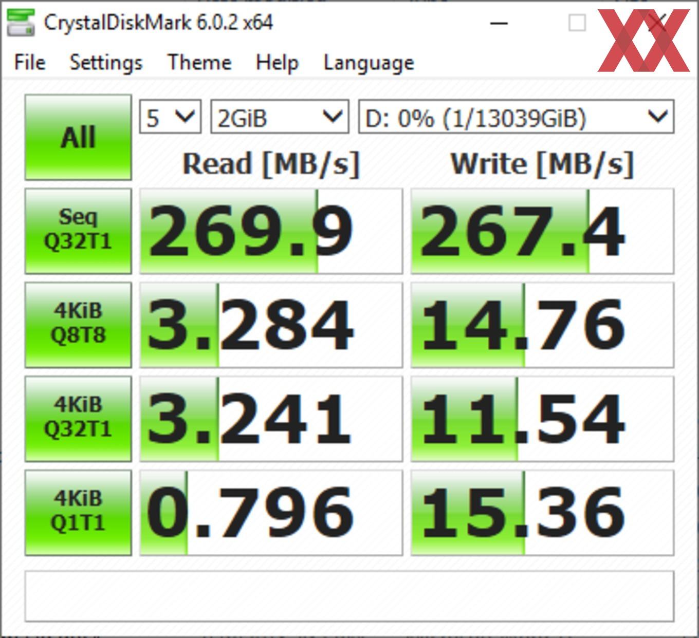 Die Exos X14 liefert wie zu erwarten gute Ergebnisse im Bereich von 270MB/s ab, wie man es bei einer modernen HDD mit 14 TB erweatet. Der Energieverbrauch ist in den Spitzen hoch, jedoch handelt es sich hier auch um eine Nearline Enterprise HDD.