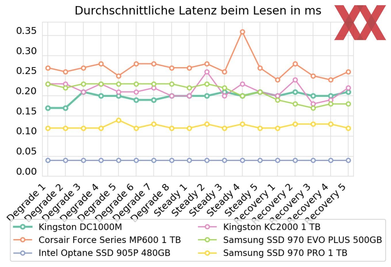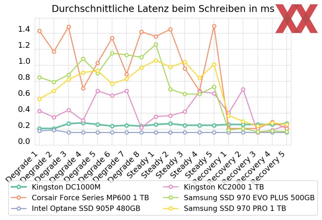Im Belastungstest kann die Kingston DC1000M grundsätzlich überzeugen. In der Schreib-Latenz gehört das Laufwerk schlicht zum Besten, das wir je getestet haben und nimmt es sogar mit der Intel Optane 905P auf, die über den gesamten Testzeitraum nur minimal die Nase vorne hat. Selbst eine sehr gute Samsung 970 PRO lässt die Kingston hier trotz TLC-NAND hinter sich.