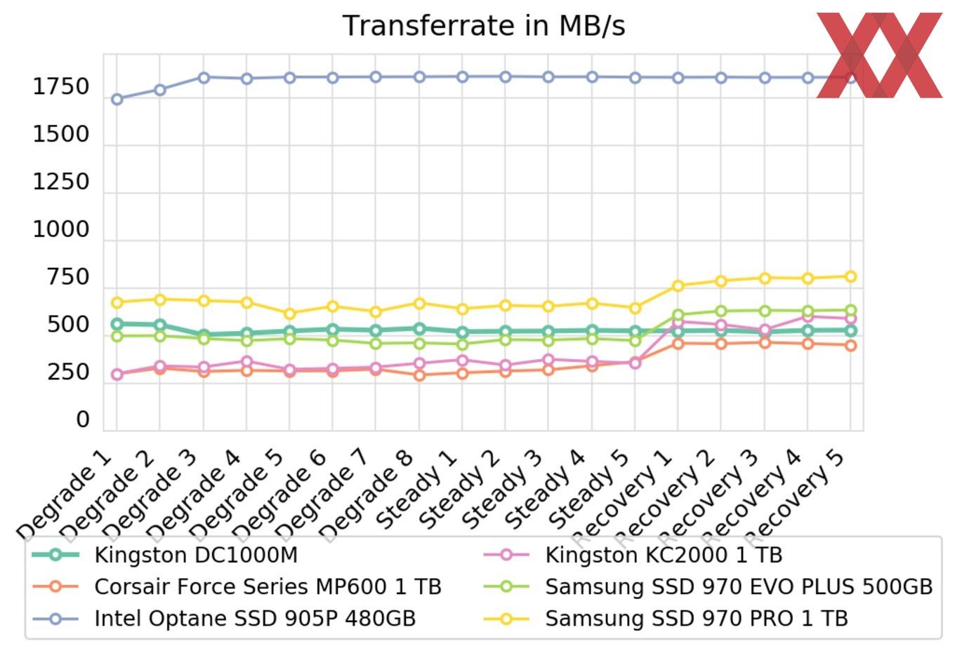 Lesend wendet sich das Blatt bereits ein wenig, da hier sowohl die 970 PRO wie auch die Optane auf einem konstant besseren Level performen. Doch bei einem Blick zur Skalenbeschriftung wird deutlich, wie knapp die Unterschiede tatsächlich sind. Dennoch wirkt sich das auch auf die Transferraten aus, bei denen die Intel immer noch wie ein Adler einsam ihre Kreise auf einem unerreichbaren Niveau zieht. Tatsächlich findet sich die Kingston DC1000M hier eher auf dem Niveau der Samsung 970 EVO wieder, überzeugt allerdings im direkten Vergleich durch ein über alle Phasen sehr konstantes Leistungsvermögen.