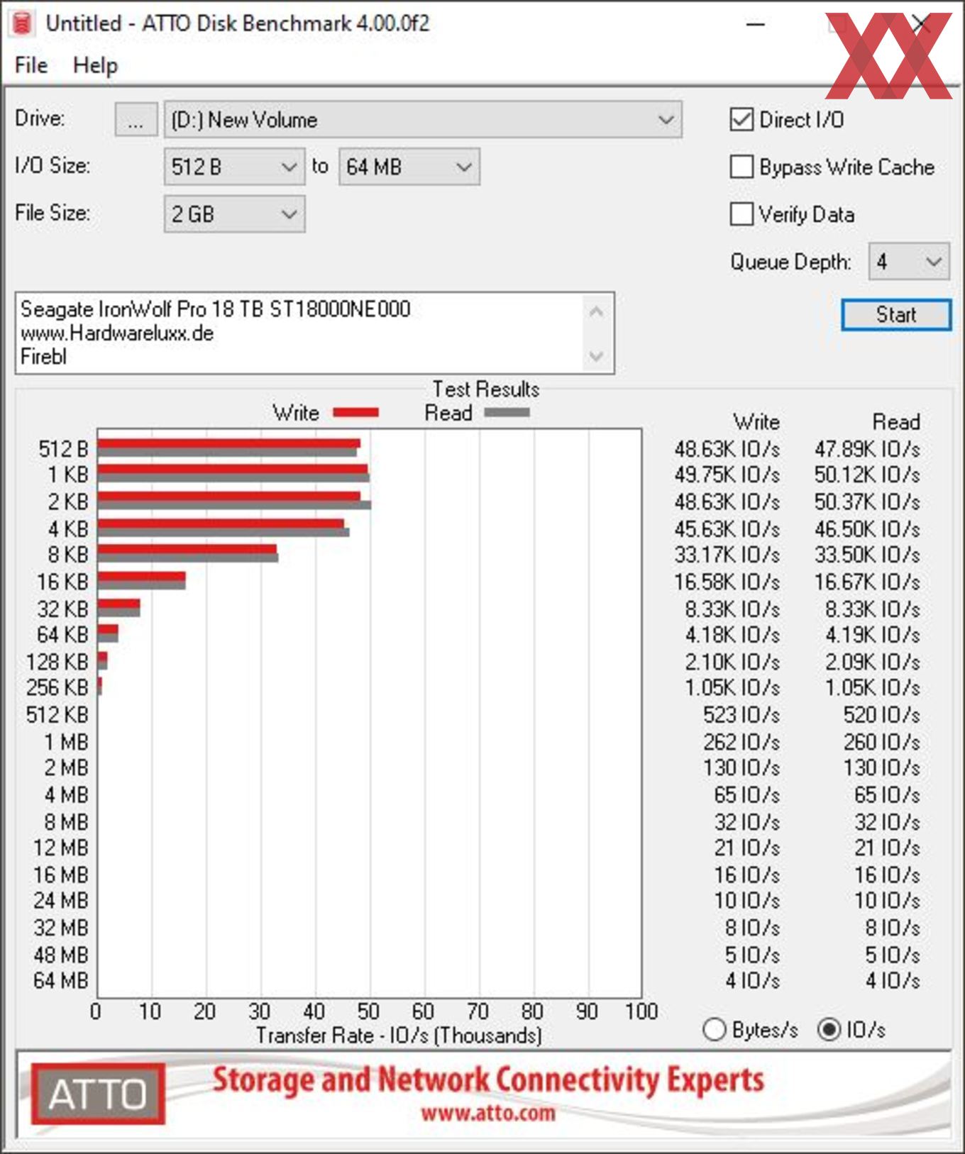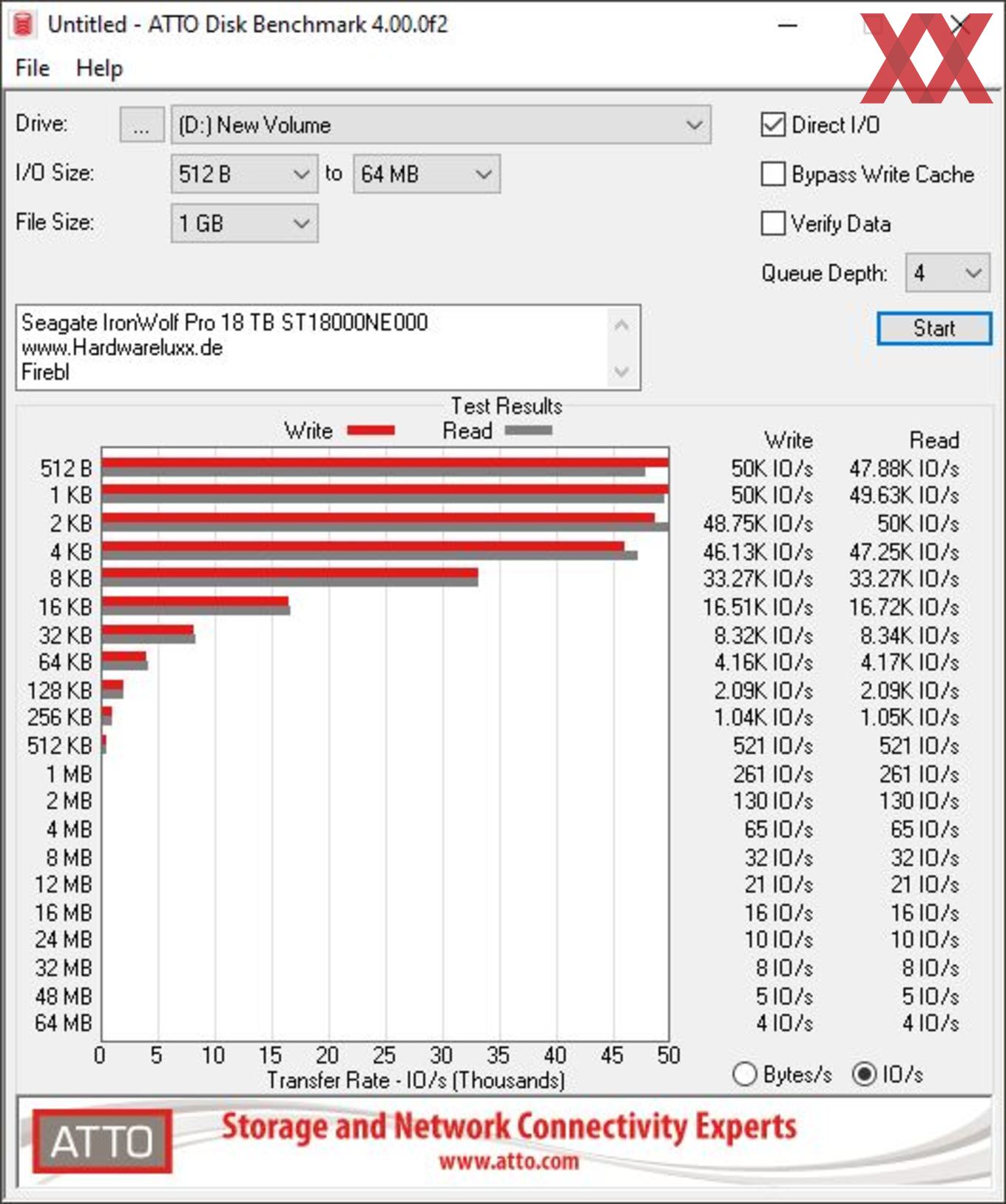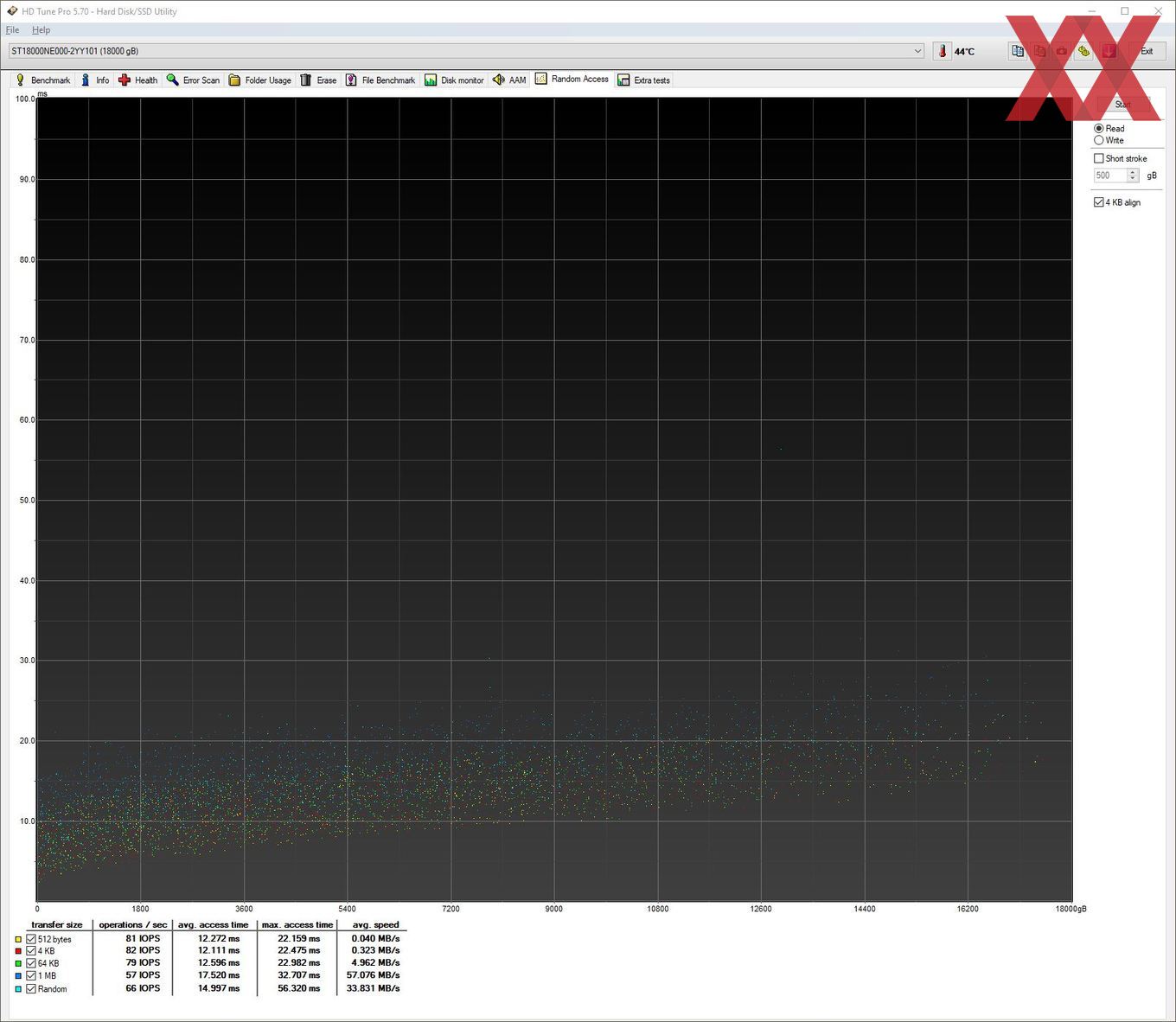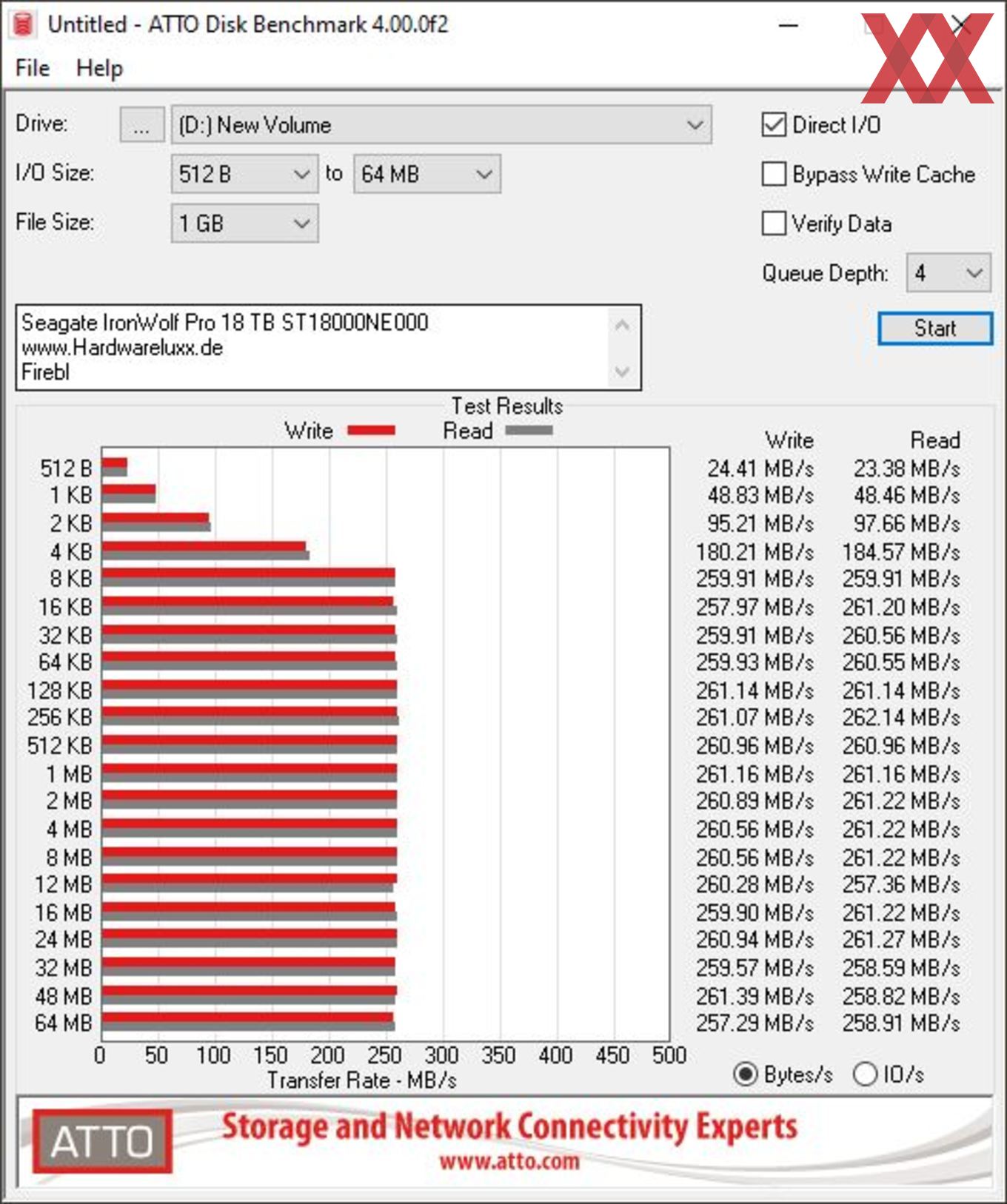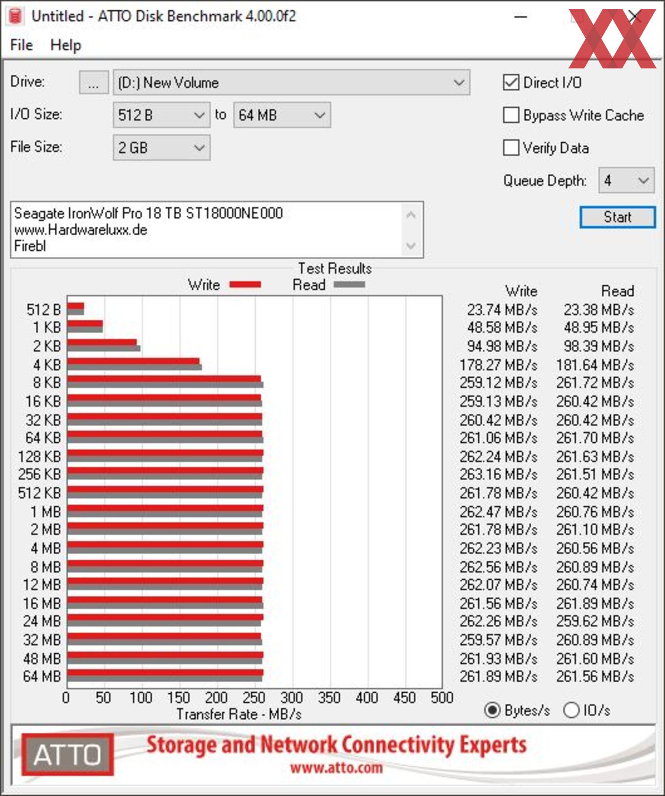 Aufgrund der höheren Datendichte von 1.146 GB/in² erhofften wir uns vor dem Test einen neuen Sieger der maximalen Transferraten-Wertung, auch wenn Seagate - wie immer - recht niedrige Daten im Datenblatt angibt. Leider hat die IronWolf Pro 18 TB keine neue Bestmarke gesetzt, was jedoch nicht heißen soll, das Modell wäre langsam. Mit durchweg über 260 MB/s gehört sie zu den schnellsten Festplatten auf dem Markt. Dennoch würden wir uns in Zukunft freuen, wenn die magische Grenze von 300 MB/s von einer Festplatte mit 7.200 rpm geknackt wird.