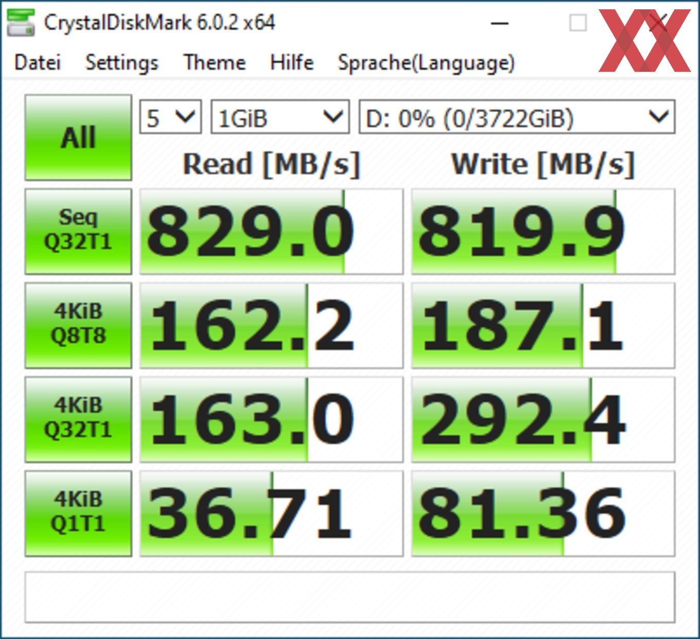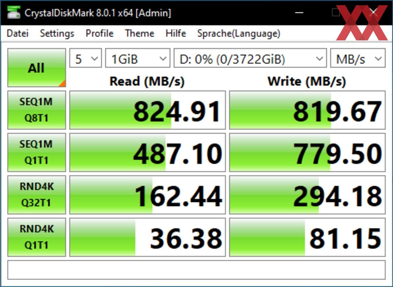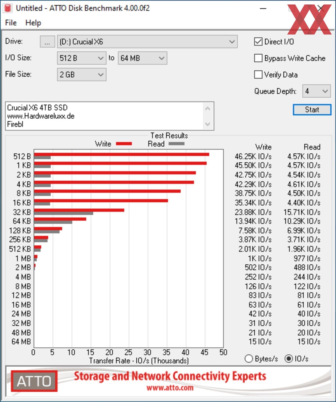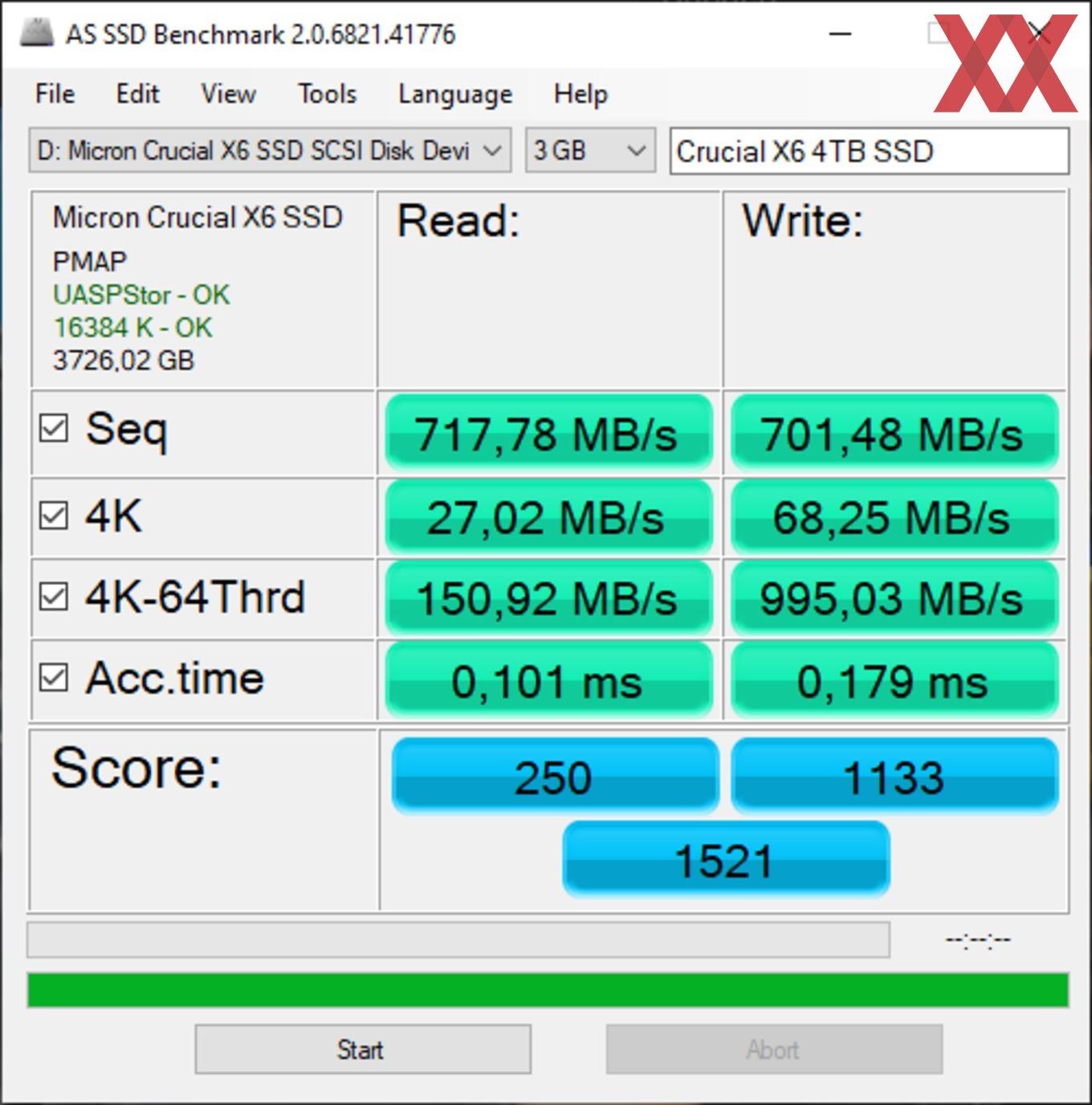 Die vom Hersteller angegebene Geschwindigkeit haben wir in den meisten Fällen erreicht. Bei den Benchmarks mit der Software ATTO konnten wir sogar die Werte übertreffen und die X6 Portable SSD hat sich auf Höhe der X8 Portable 2 TB eingereiht. Wir haben den Test mehrmals wiederholt und konnten diese Ergebnisse immer wieder ermitteln. Um eine evtl. Drosselung feststellen zu können, haben wir auch eine große Datei auf die SSD kopiert. Bei einer Testdatei mit 300 GB war keine Drosselung messbar.