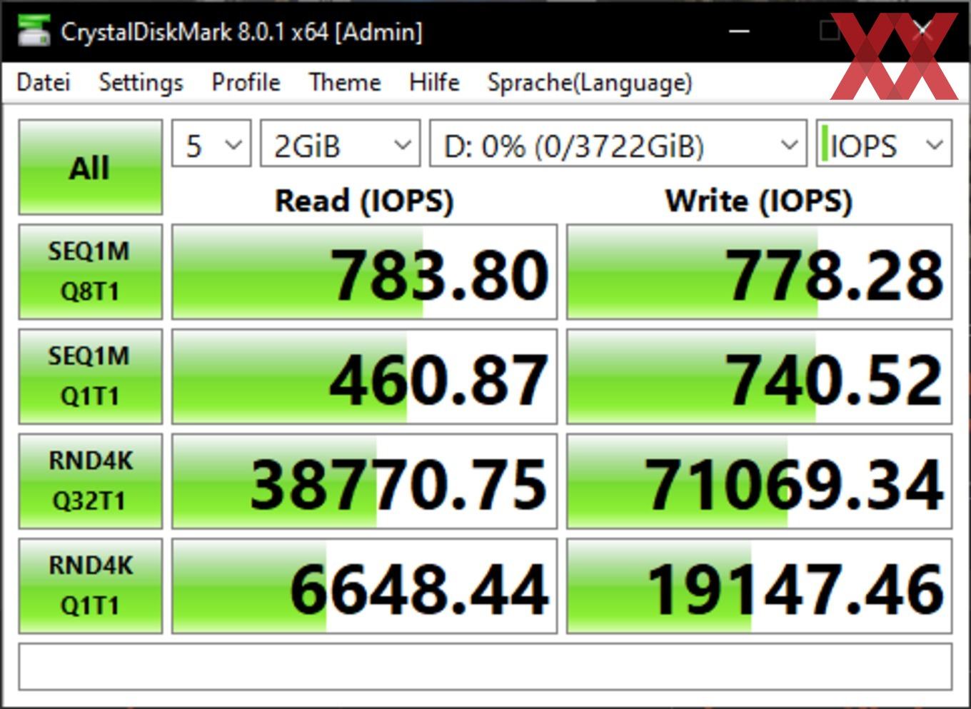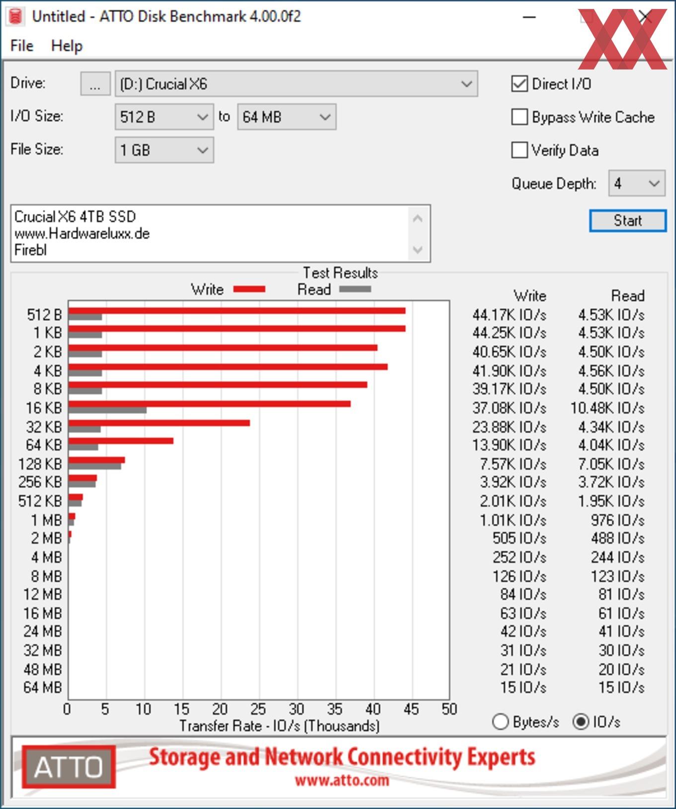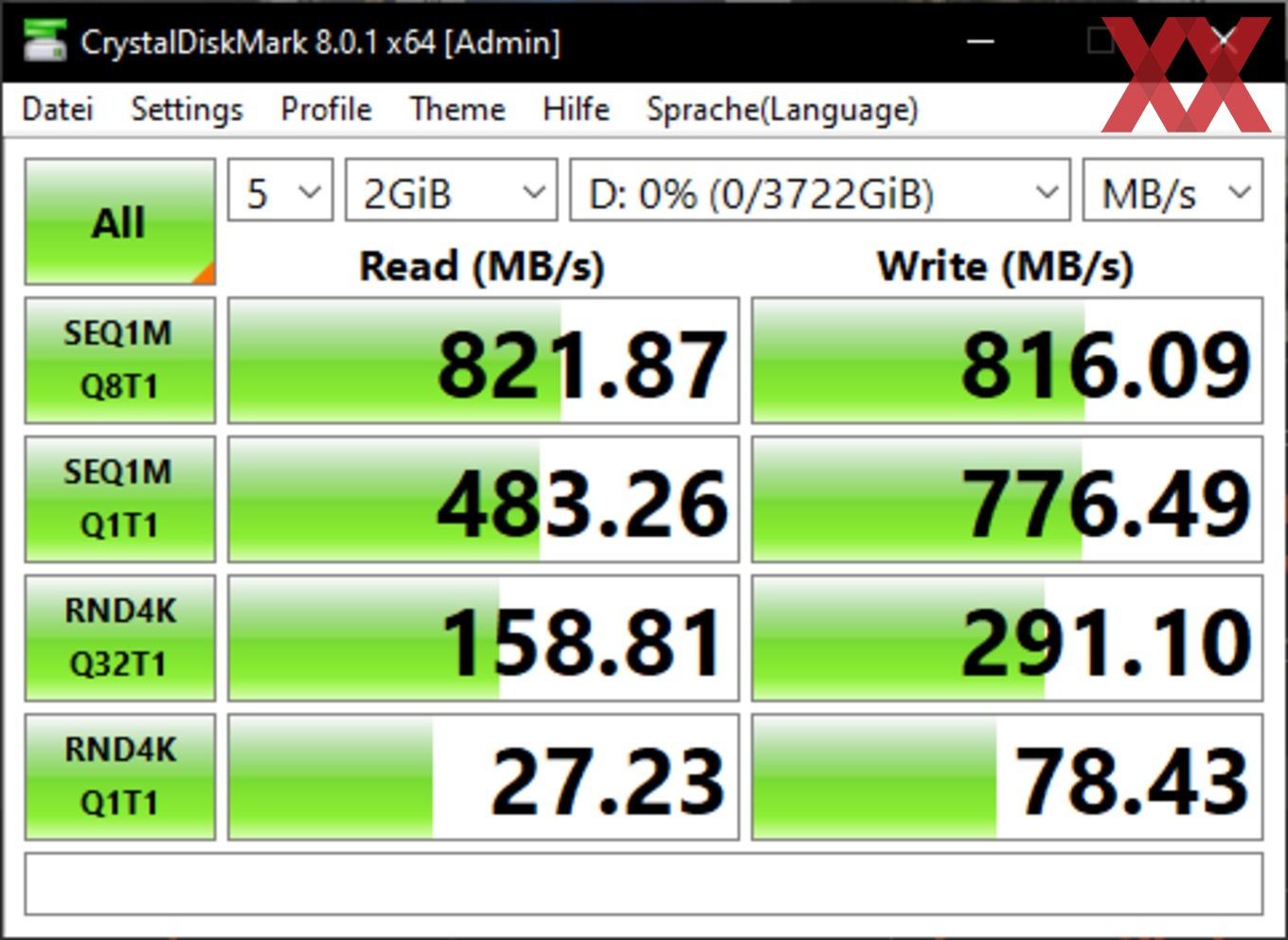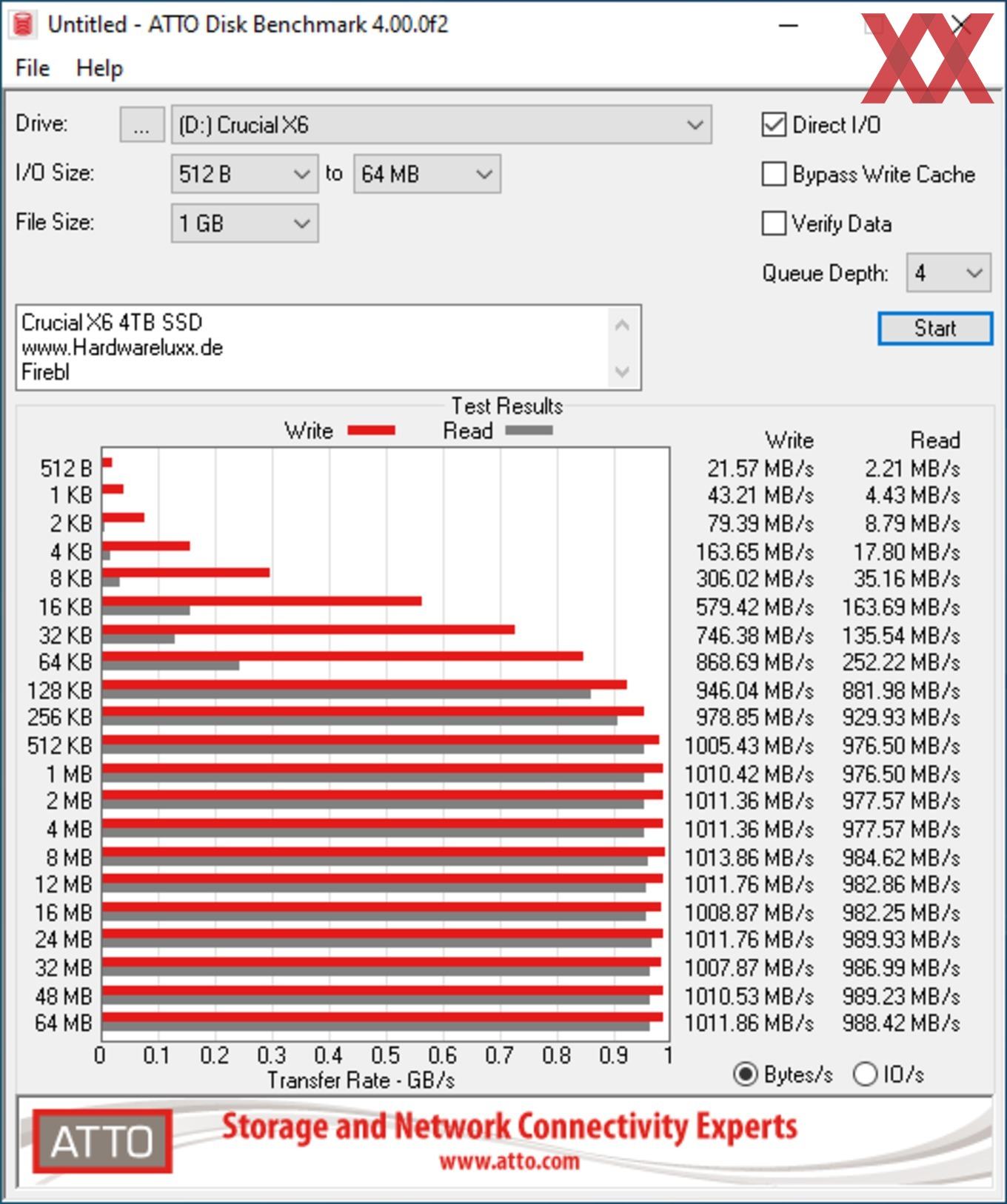 Die vom Hersteller angegebene Geschwindigkeit haben wir in den meisten Fällen erreicht. Bei den Benchmarks mit der Software ATTO konnten wir sogar die Werte übertreffen und die X6 Portable SSD hat sich auf Höhe der X8 Portable 2 TB eingereiht. Wir haben den Test mehrmals wiederholt und konnten diese Ergebnisse immer wieder ermitteln. Um eine evtl. Drosselung feststellen zu können, haben wir auch eine große Datei auf die SSD kopiert. Bei einer Testdatei mit 300 GB war keine Drosselung messbar.