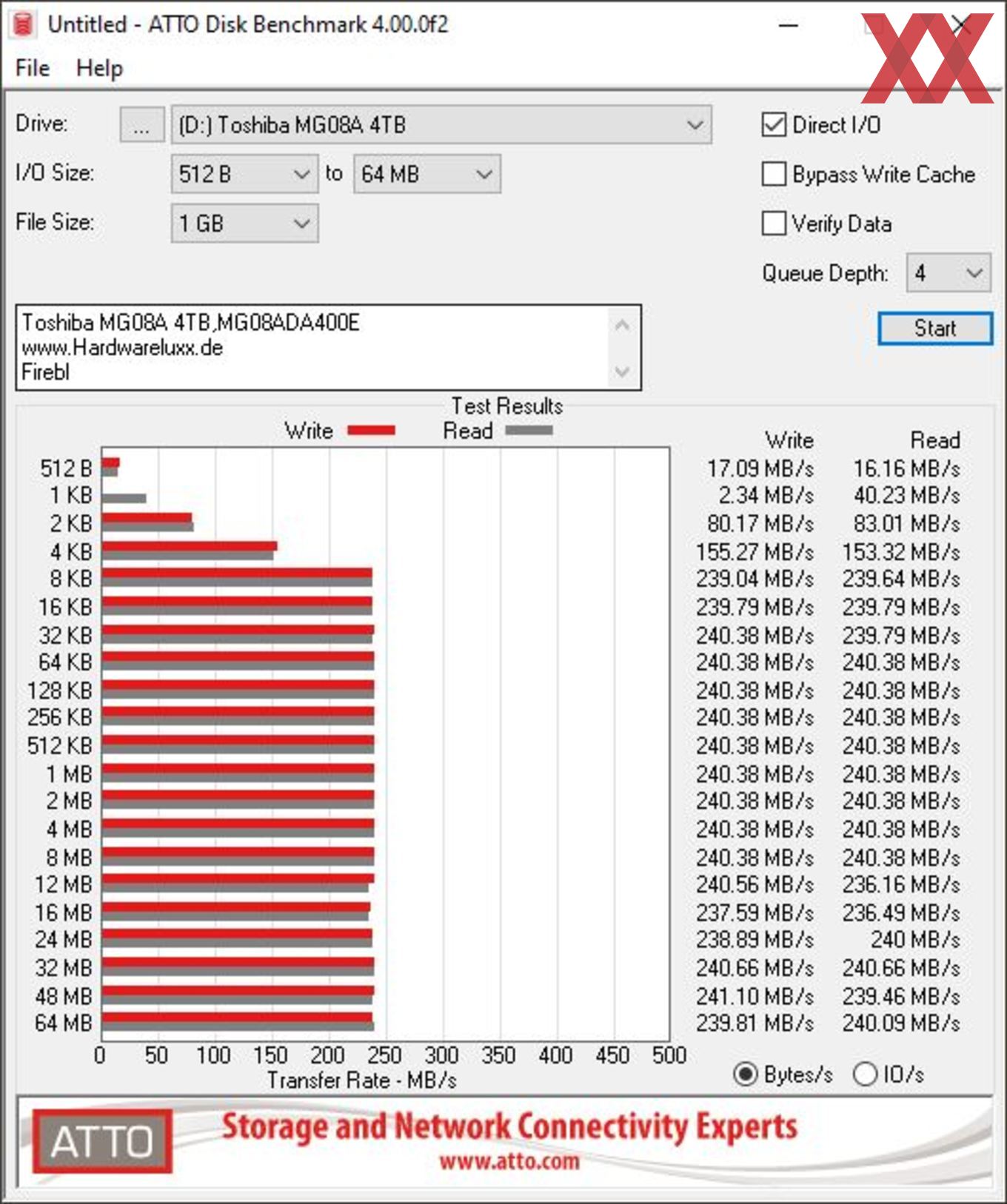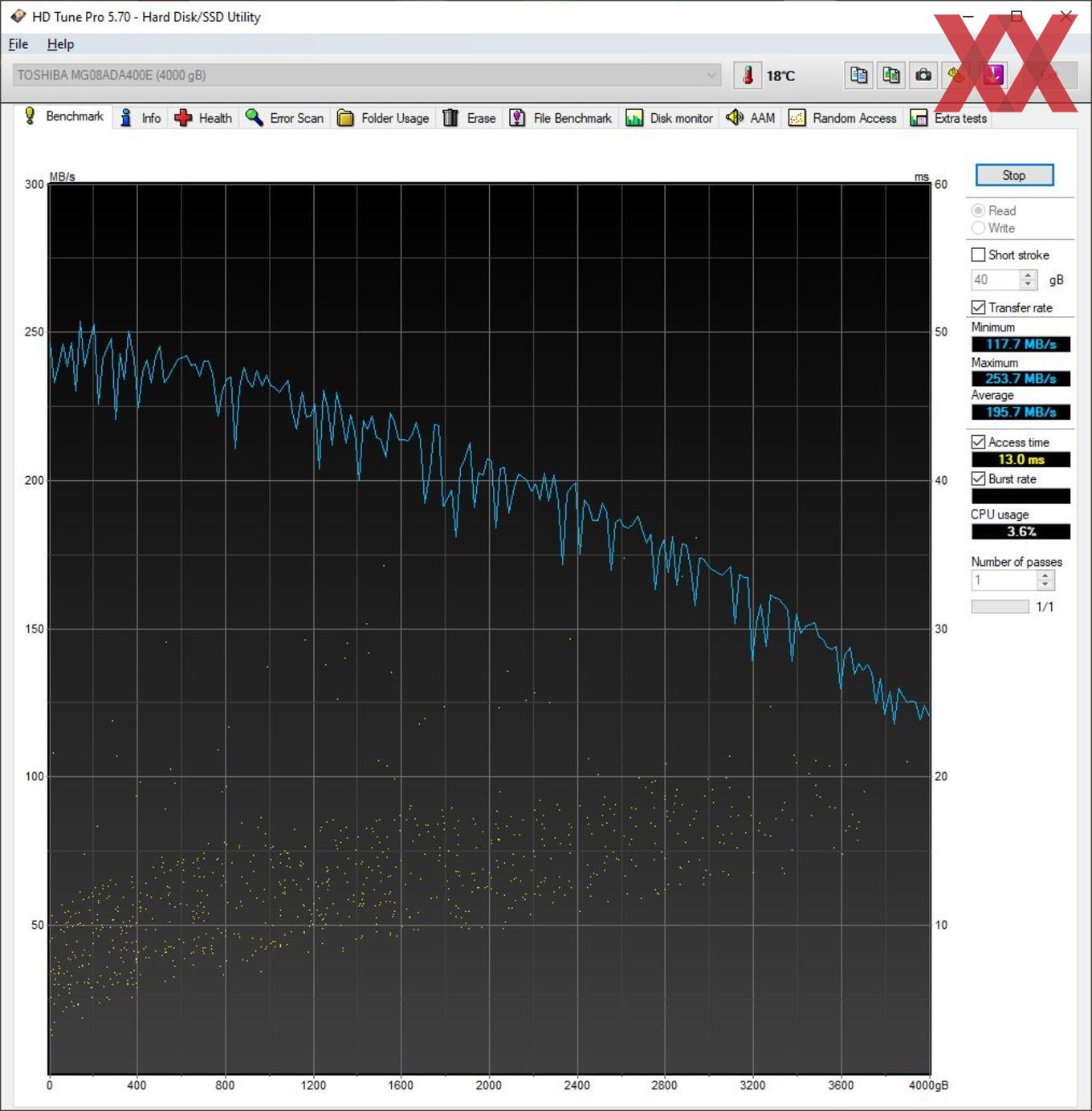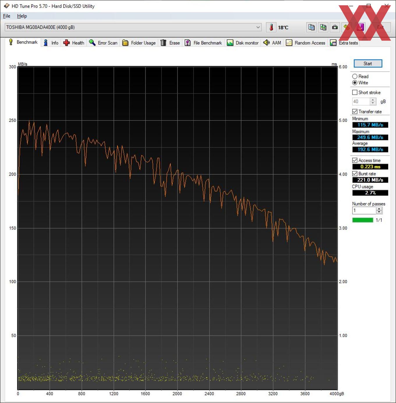 Die MG08-D, 4 TB, zeigt eindrucksvoll, dass die Auffrischung ihrer Technologie erfolgreich und notwendig war. Verglichen mit den Ergebnissen der MG03ACA400 (ca. 165 MB/s) und der MG04ACA400E (Herstellerangabe 185 MB/s) ist die MG08-D als 4-TB-Enterprise-HDD-Produkt deutlich schneller geworden. In HD-Tune ist sie sogar die schnellste neue Luft-gefüllte Festplatte, vor der WD_BLACK Performance Desktop Hard Drive 6 TB in der Generation WD6003FZBX (ehemals Western Digital Black).