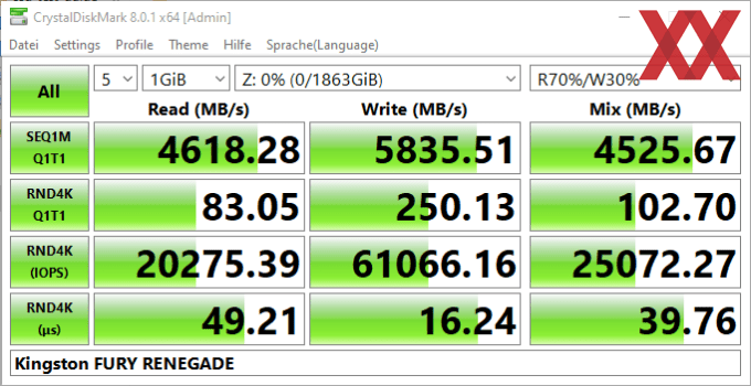 Leider konnten wir im CrystalDiskMark die Herstellerangaben zumindest sequenziell lesend deutlich nicht erreichen. Woran das liegt, war letztlich nicht ganz deutlich, zumal wir bis zu diesem Zeitpunkt bereits mehrmals ermitteln konnten, dass unser Testmuster eine Schreibleistung von mehr als 6 GB/s bietet. Wir vermuten, dass das Over-Provisioning bzw. die Firmware hier mit dem CrystalDiskMark etwas Probleme bereitet. Dazu passend sind auch die Lese-Transferraten, bei denen wir sogar die Herstellerangabe leicht übertreffen konnten.
