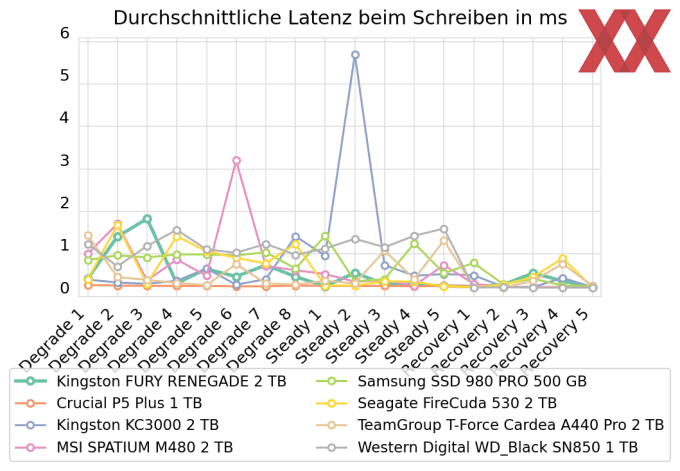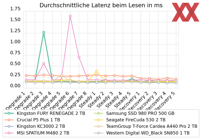 Im abschließenden Belastungstest zeigt sich besonders gut im Vergleich zur KC3000 der Vorteil der FURY RENEGADE. Können unter idealen Umständen die Massenspeicher noch jeweils identisch gut performen, zeigt sich der Vorteil des extra zugesicherten Speichers durchaus in kritischeren Phasen. Dieses Verhalten haben auch bei der TeamGroup T-Force Cardea A440 Pro und der Seagate FireCuda 530 festgestellt, wobei das Leistungsniveau dieser beiden tendenziell noch einen Tick höher liegt.