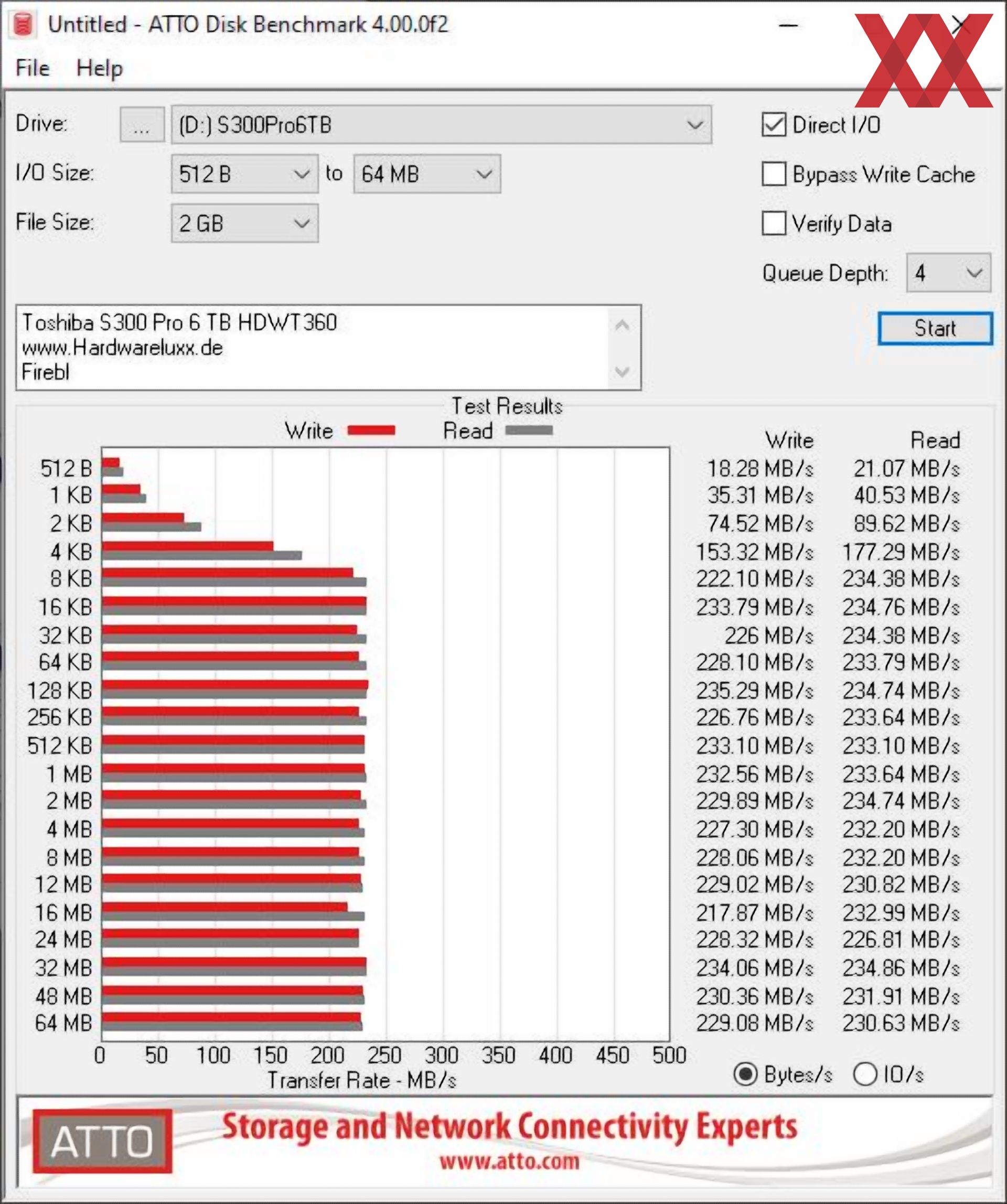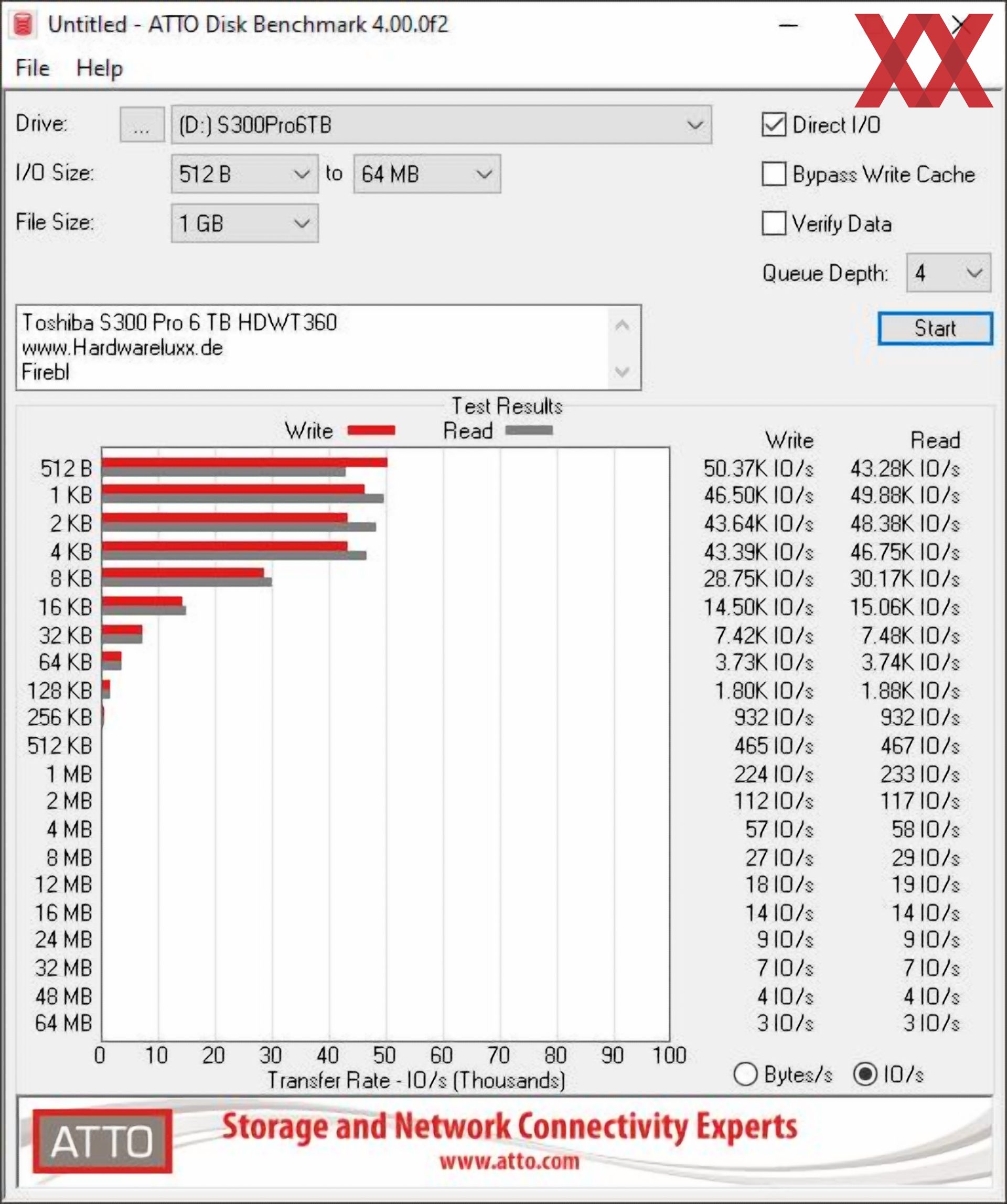 Aus Sicht der Benchmarks bewegt sich die S300 Pro 6 TB ca. 5 % unterhalb der bisher schnellsten 6-TB-Festplatte, der Western Digital Black 6003 aus unserem 6-TB-Festplatten-Round-up. Vergleicht man die Werte der S300 Pro mit anderen Toshiba-Festplatten aus diesem Artikel, welche zu älteren Generationen gehören, so kann man sehr gut den Fortschritt erkennen, welcher mit der S300 Pro einhergeht. Verglichen mit der X300 6 TB bringt die S300 Pro 10 % mehr Leistung bei erheblich geringerer Leistungsaufnahme.