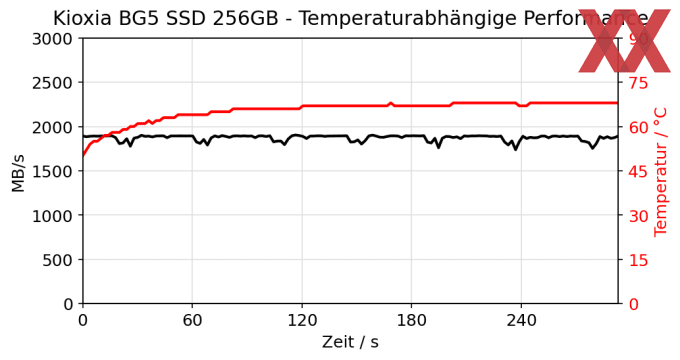 Kommen wir also zum ersten Test der Kioxia BG5, indem wir bei sommerlichen Temperaturen versuchen, die SSD durch maximale Belastung zum temperaturbedingten Drosseln zu bewegen. Obwohl die BG5 komplett auf kühlende Lösungen wie bereits ein Aluminium- oder Grafit-Etikett verzichtet, konnten wir unser Sample nie auf die Schwelle von 70 °C oder höher erhitzen. Dies schlägt sich auch darin nieder, dass auch nach fünf Minuten Dauerfeuer keine Drosselung zu bemerken war. Kioxia bewirbt unser Sample mit einer maximalen Leistungsaufnahme von 4 W, sodass dies auch wenig überrascht. Gerade in mobilen, engen Systemen ist dies definitiv ein positiver Aspekt für die BG5.