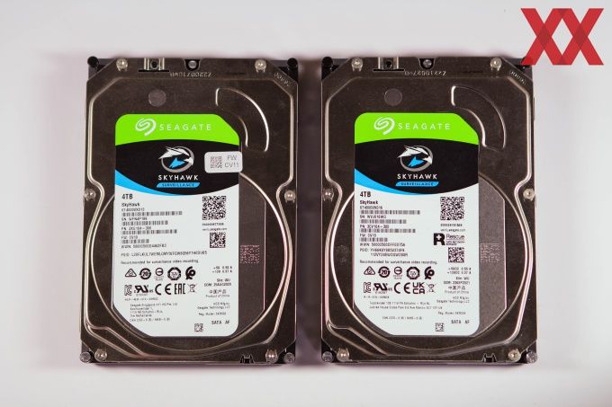Die Oberseite der Festplatte mit dem Etikett der SkyHawk-Serie. Die spiegelnde Oberfläche wird aufnahmebedingt dunkel dargestellt. Die Unterseite der Festplatte bietet Hohlräume im Design, obwohl es sich um einen besonderen Formfaktor bei dieser Festplatte handelt.