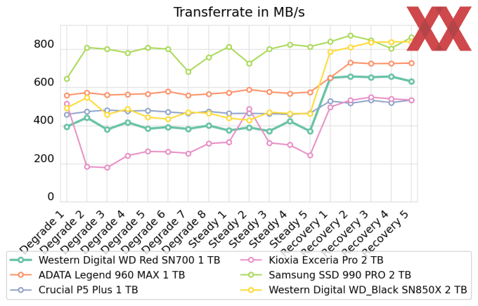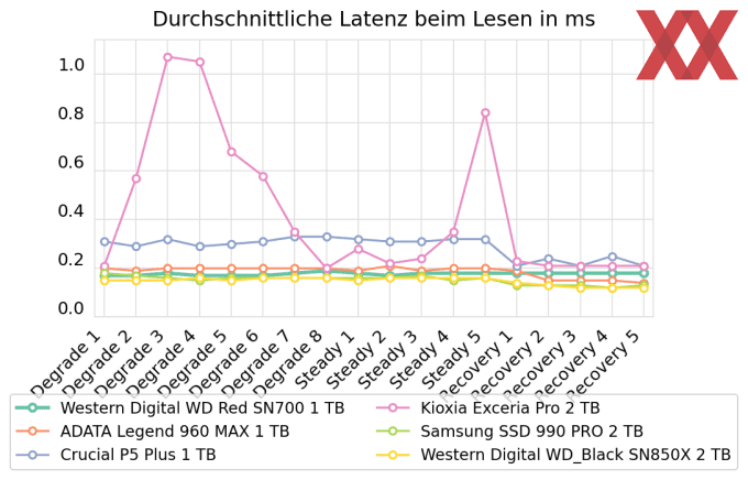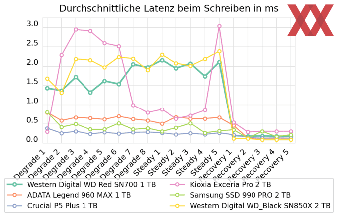 Im abschließenden Belastungstest kann die WD Red SN700 nochmals überzeugen und sich für höhere Aufgaben qualifizieren. So sind die Lese-Latenzen über alle Testphasen hinweg auf absolutem High-End-Niveau, während die Schreib-Latenzen zwar etwas schwächer, aber durchaus vergleichbar mit der WD_Black SN850X sind. In jedem Fall handelt es sich dabei um Leistungswerte, die aus unserem Testsample durchaus mehr als einen reinen "Netzwerkspeicher" machen. Die resultierenden Transferraten untermauern diese These, indem praktisch konstant die Kioxia Exceria Pro geschlagen wird und je nach Phase selbst die Crucial P5 Plus und die ADATA Legend 960 MAX in Reichweite sind. Die Charakteristik der Red SN700 ist auffällig nahe der WD_Black SN850X aus selbem Hause, wobei diese wiederum konstant besser performt und dem HighEnd-Anspruch gerecht wird.