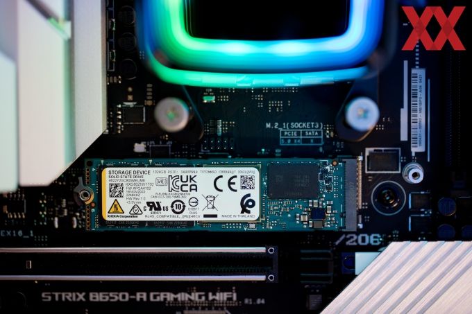 Mit Beginn der PCIe5-Ära haben wir auch unser Testsystem entsprechend aktualisiert. Als neue Grundlage dient daher ein ASUS ROG STRIX B650-A Gaming WIFI, das insgesamt vier PCIe5-Lanes der CPU für unsere Massenspeicher zur Verfügung stellt. Diese stammen vom AMD Ryzen 5 7600, der mit sechs Kernen und doppelt so vielen Threads mehr als genug CPU-Power für unsere Tests bietet. 32 GB DDR5-RAM in Form des Gigabyte Aorus Memory Kits sind außerdem verbaut, sowie zur Kühlung die Enermax AquaFusion Black 360. Zusammengehalten werden die Komponenten weiterhin im Enermax Saberay.