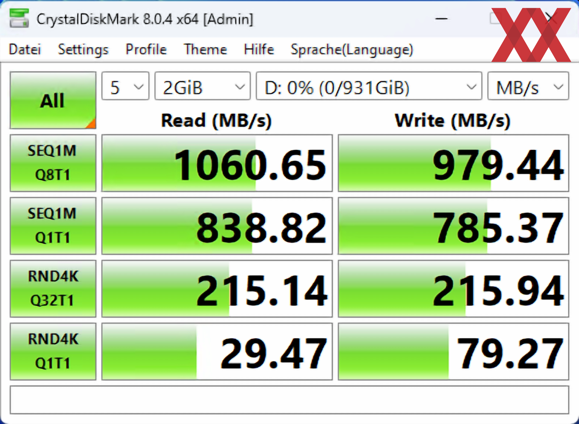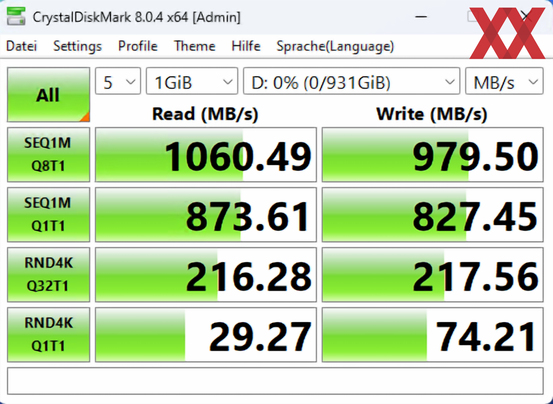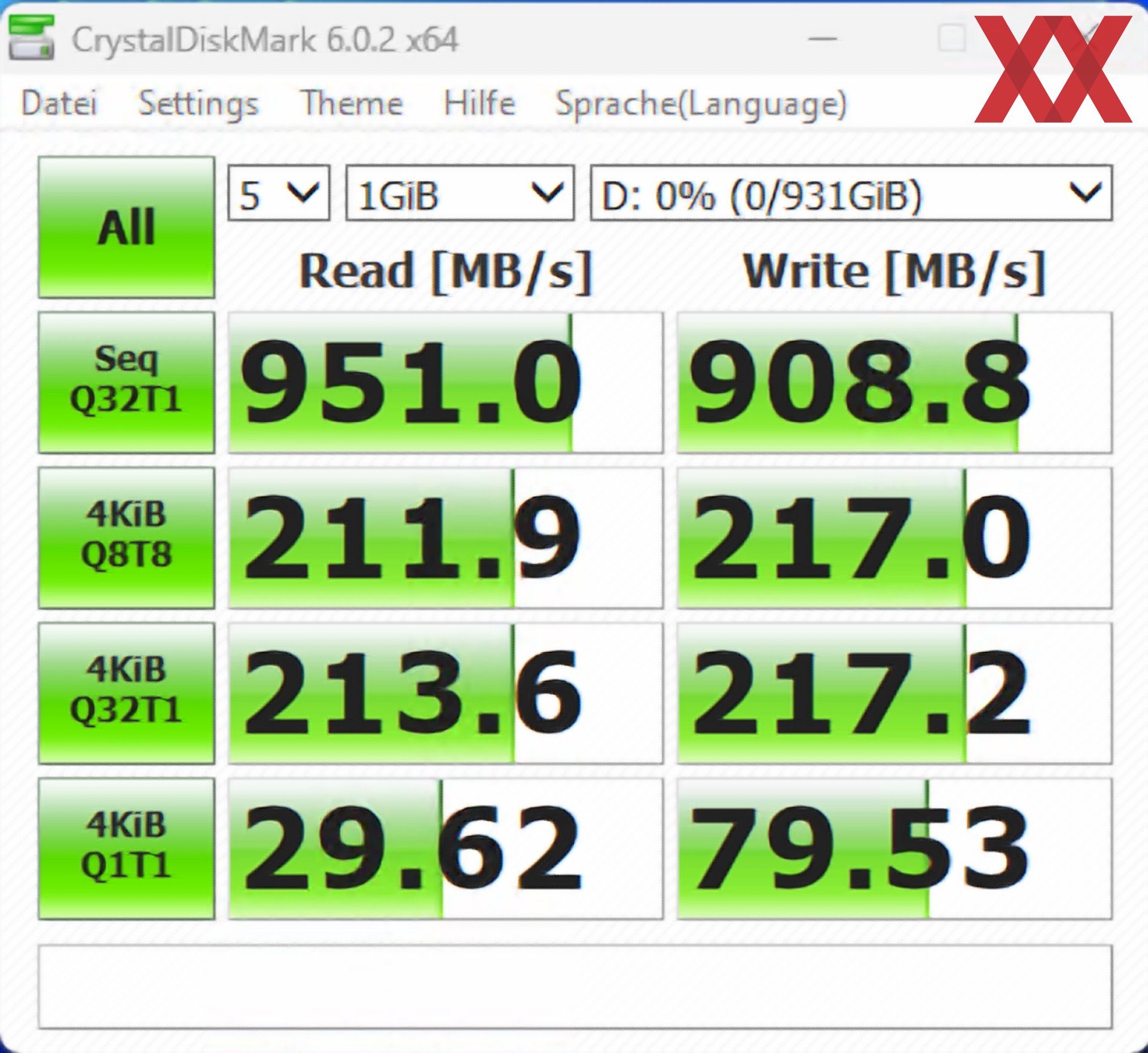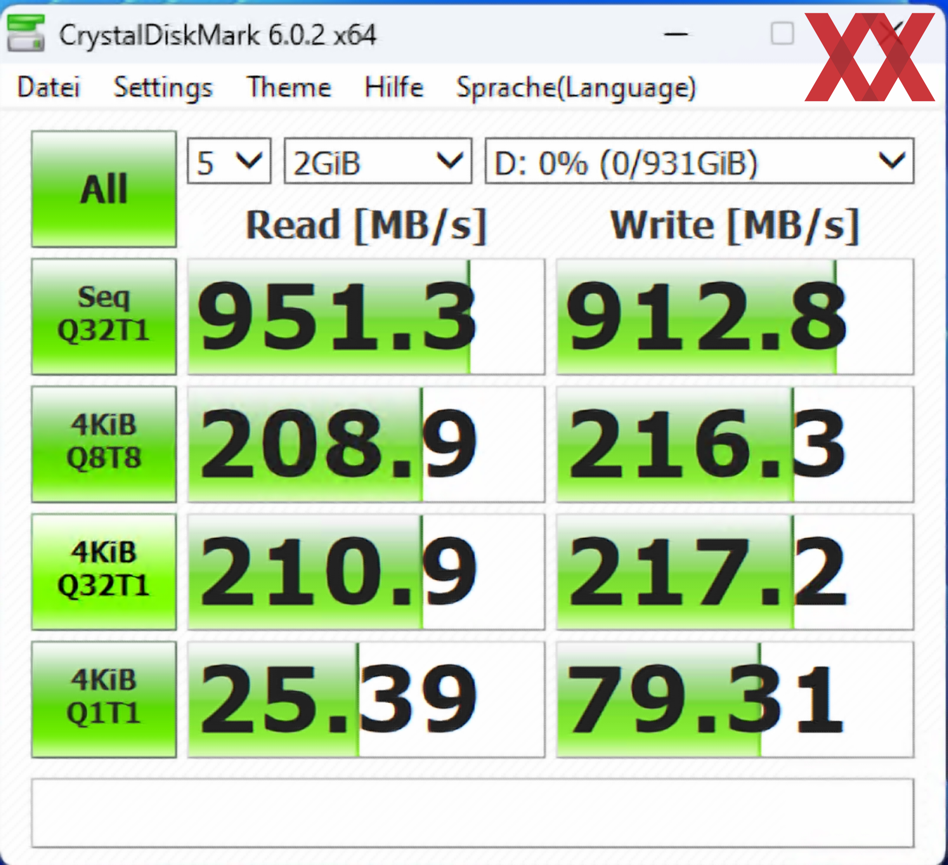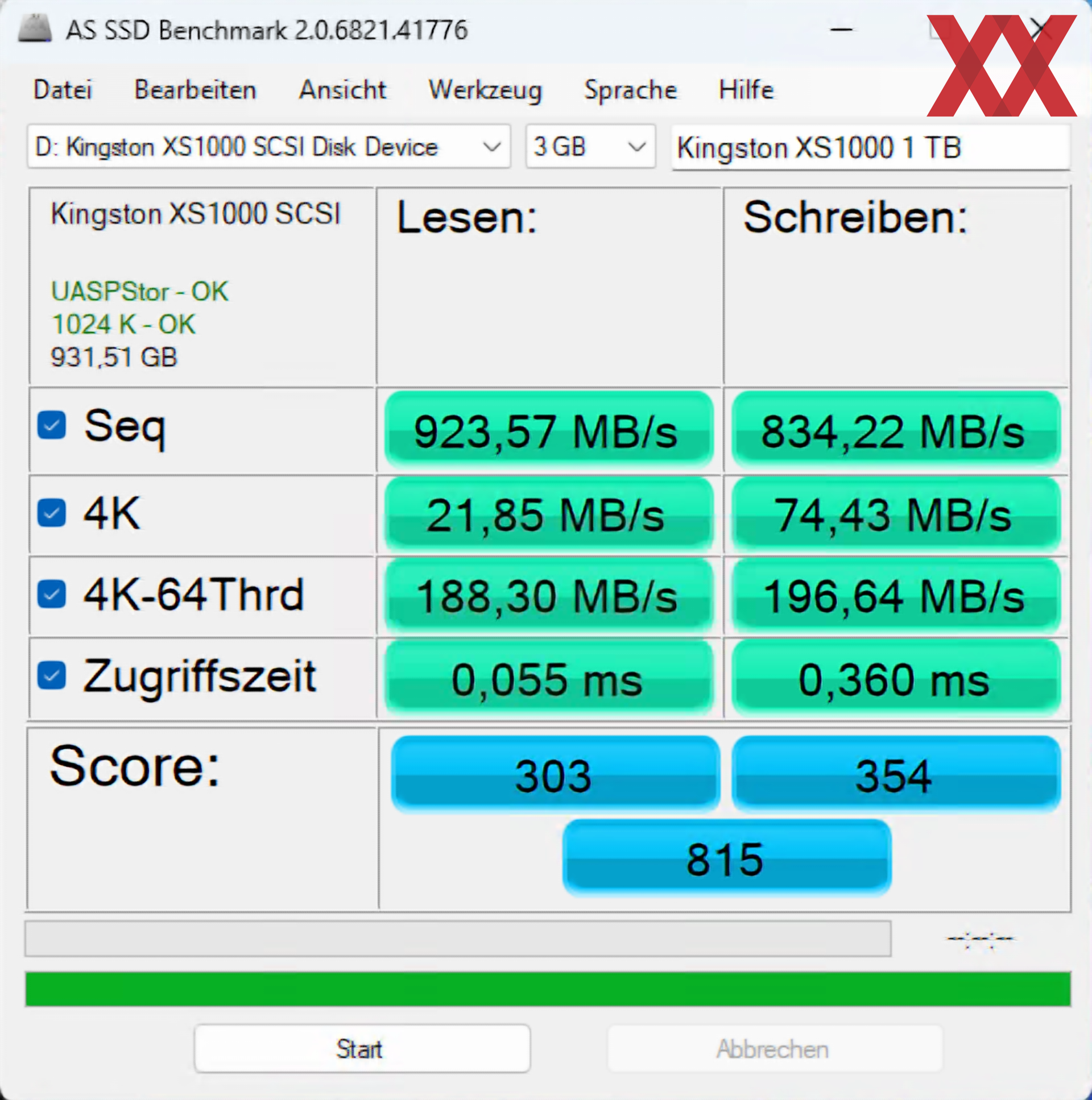 Die im Benchmark ermittelten Werte entsprechen den beworbenen Angaben und stellen das Maximum für eine SSD mit USB3.2-Gen2-Anschluss dar. Mit rund 1000 MB/s maximaler Transferrate nutzt die XS1000 die ihr zur Verfügung stehende Bandbreite voll aus.