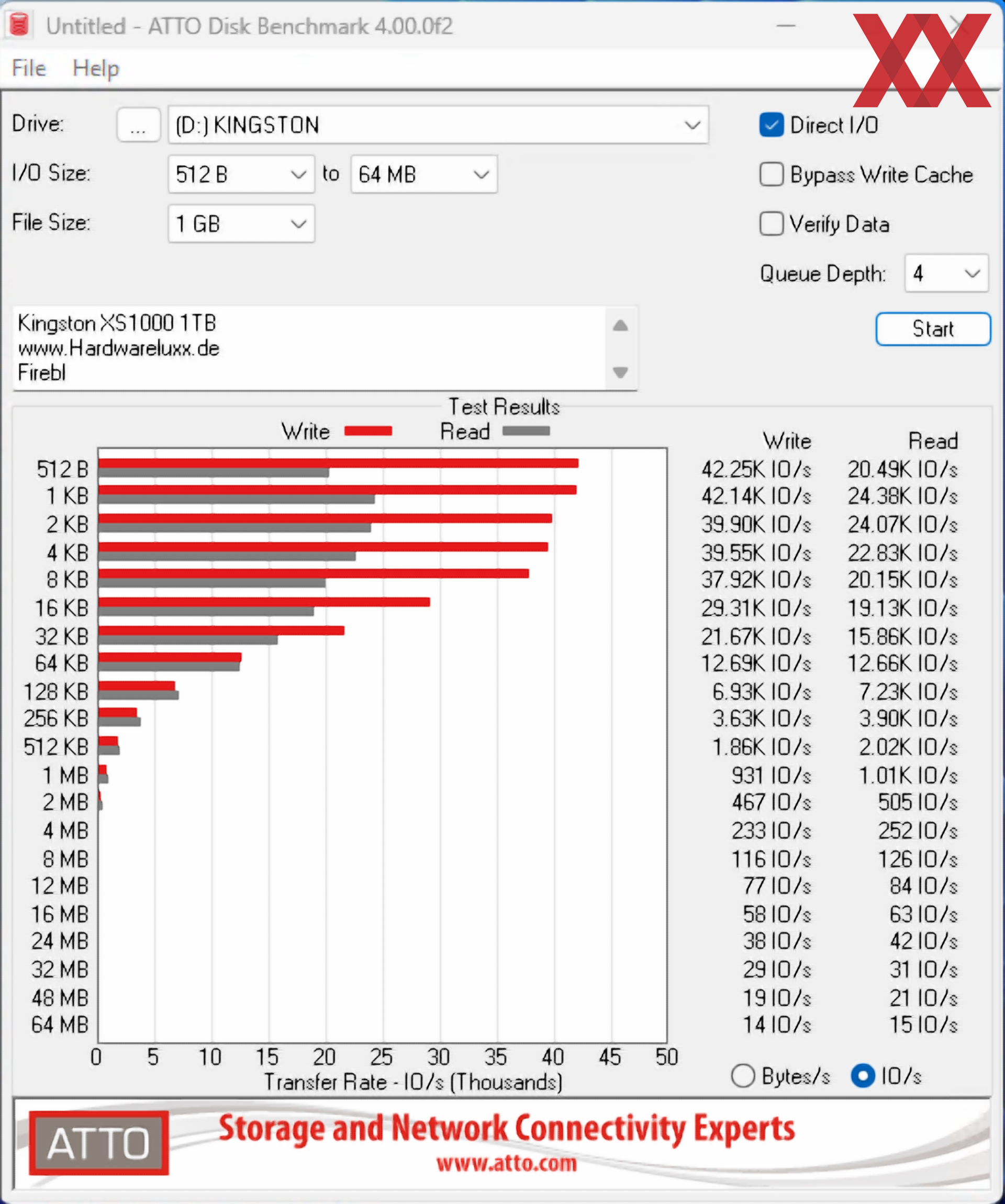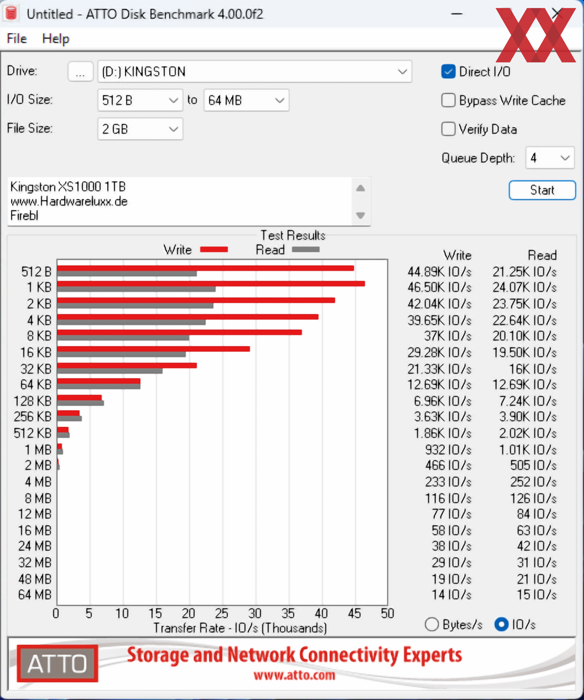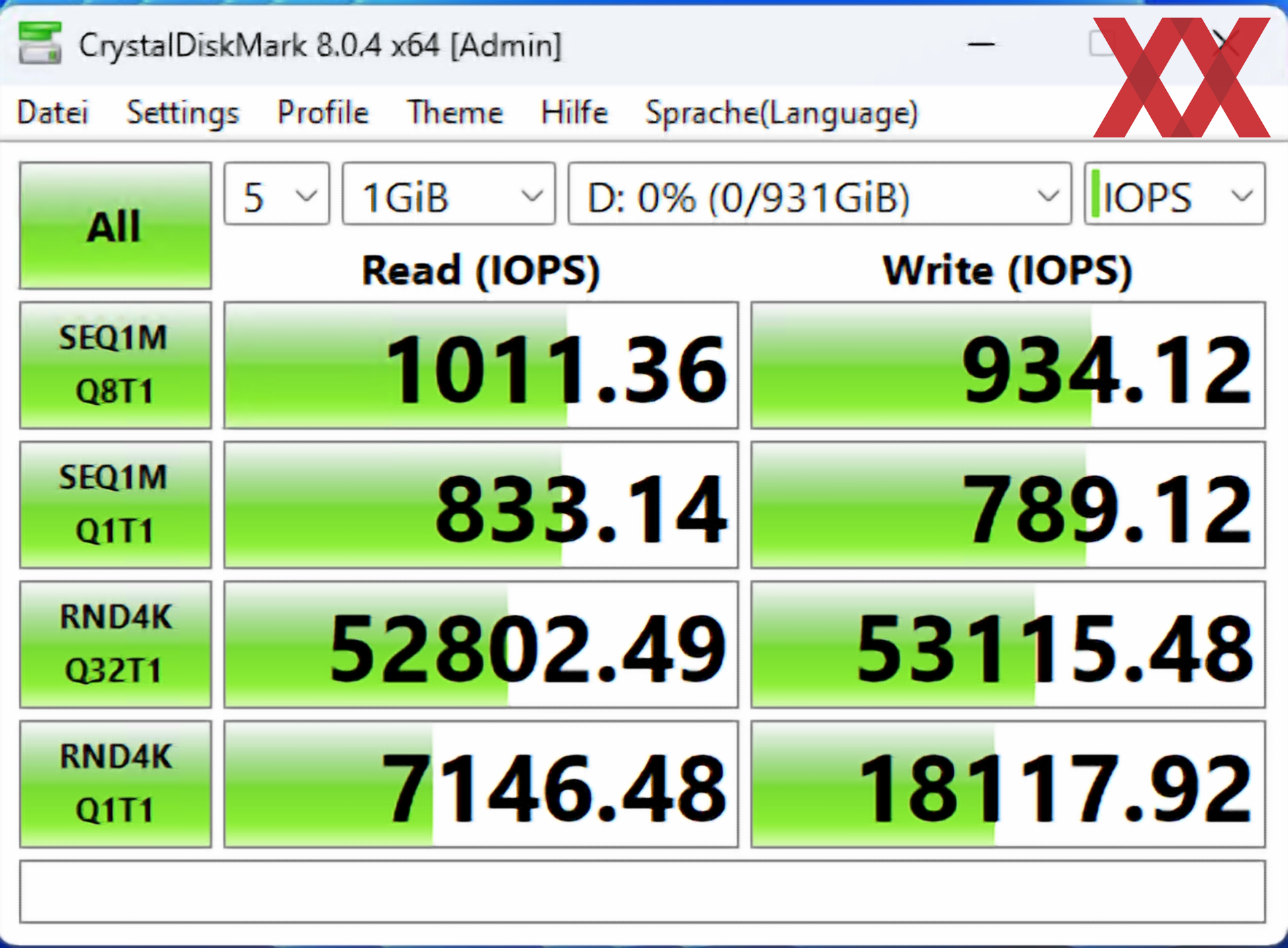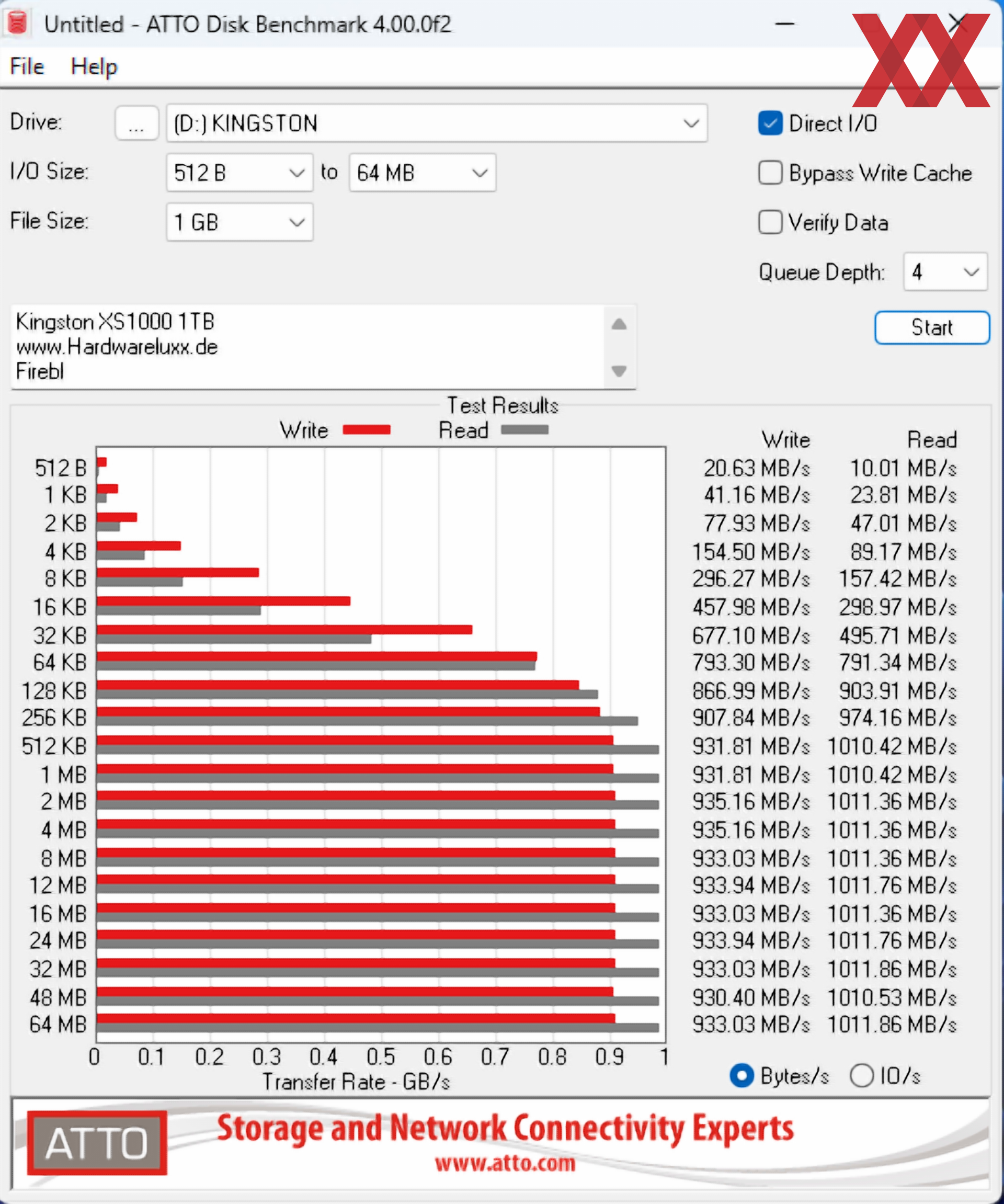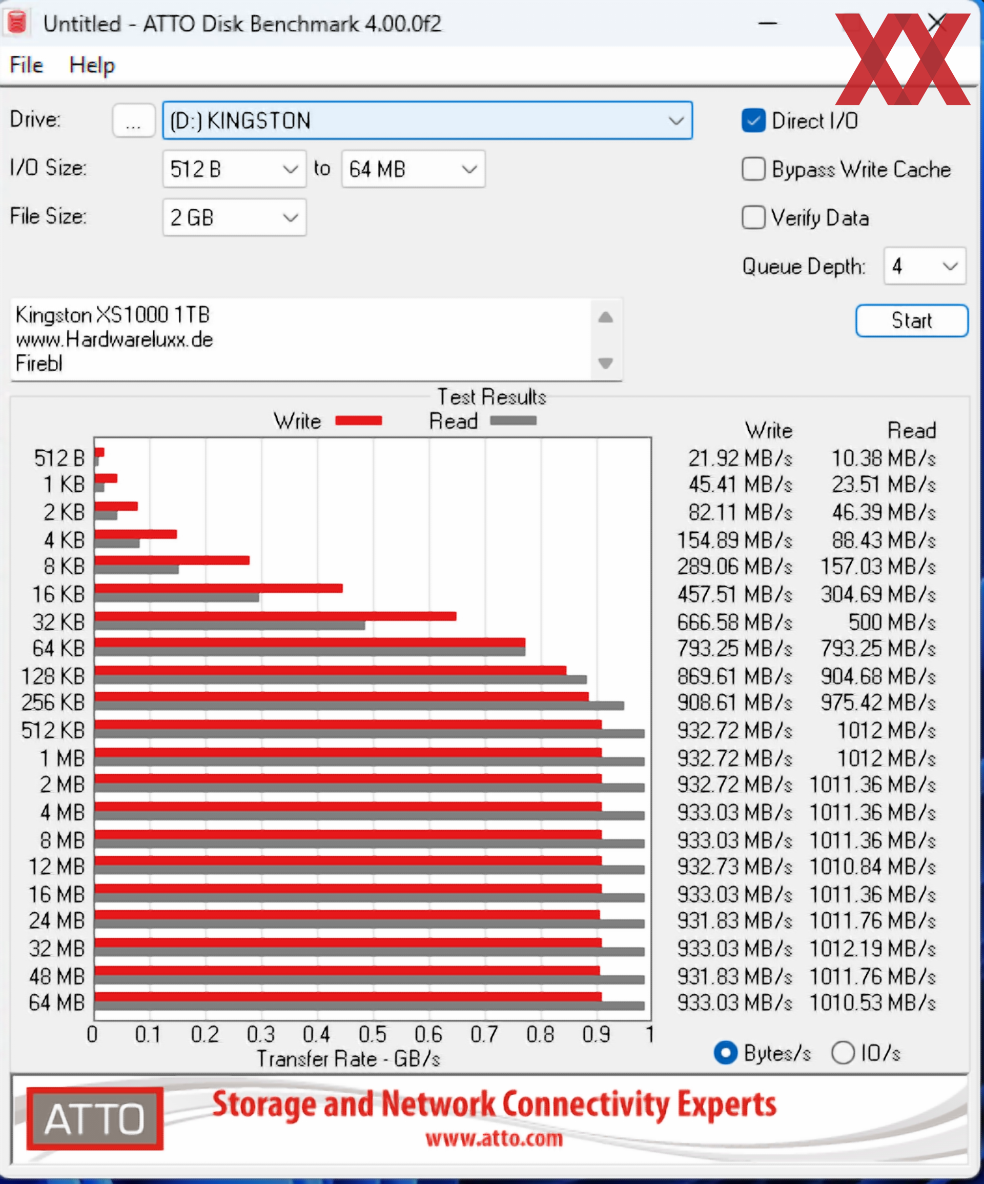 Die im Benchmark ermittelten Werte entsprechen den beworbenen Angaben und stellen das Maximum für eine SSD mit USB3.2-Gen2-Anschluss dar. Mit rund 1000 MB/s maximaler Transferrate nutzt die XS1000 die ihr zur Verfügung stehende Bandbreite voll aus.